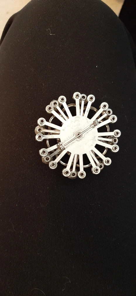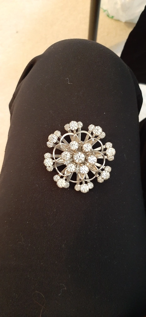 Selling a vintage silver-tone brooch in a snowflake design. It has a pin on the back to attach to clothing. It is in great condition