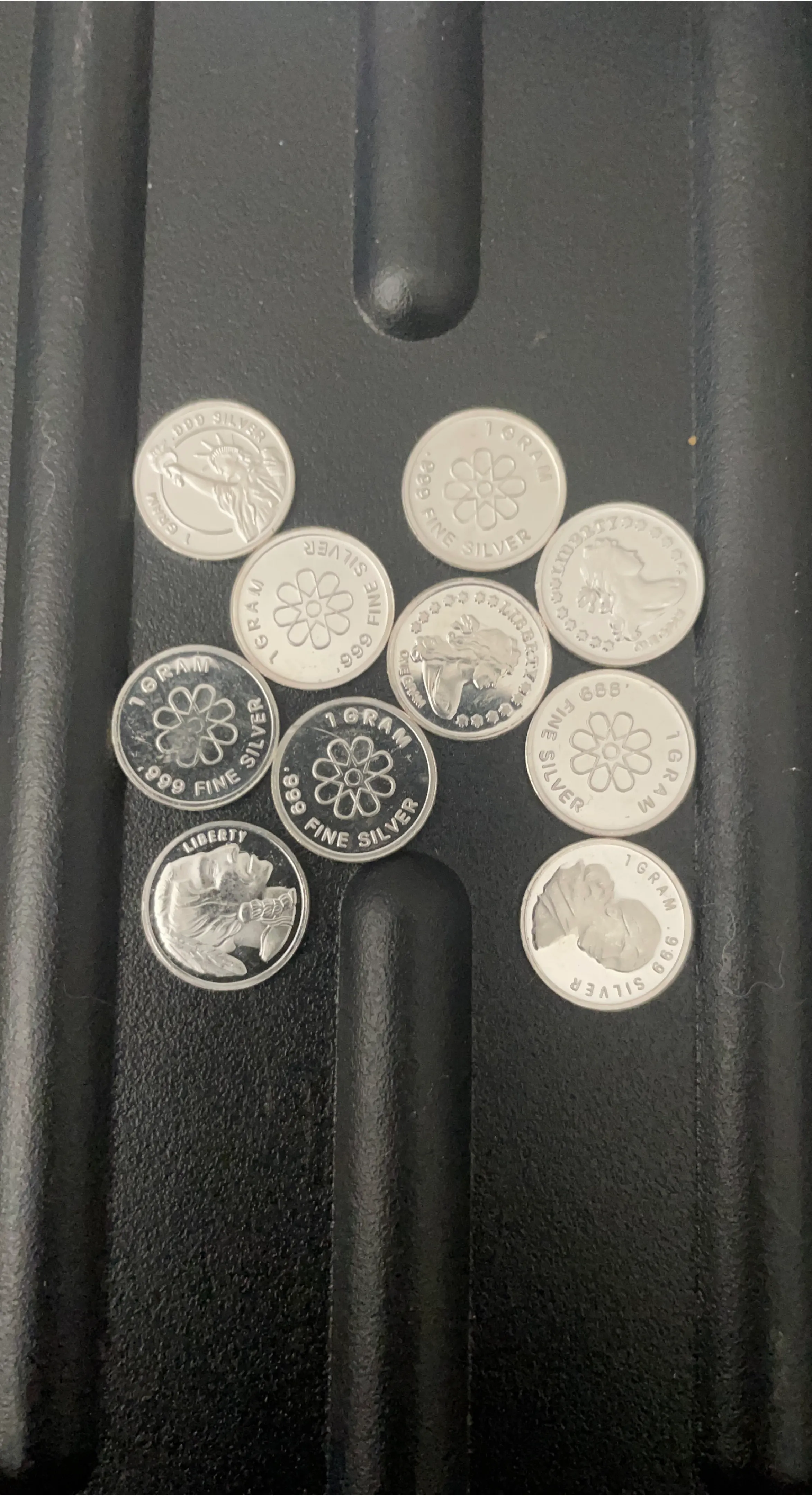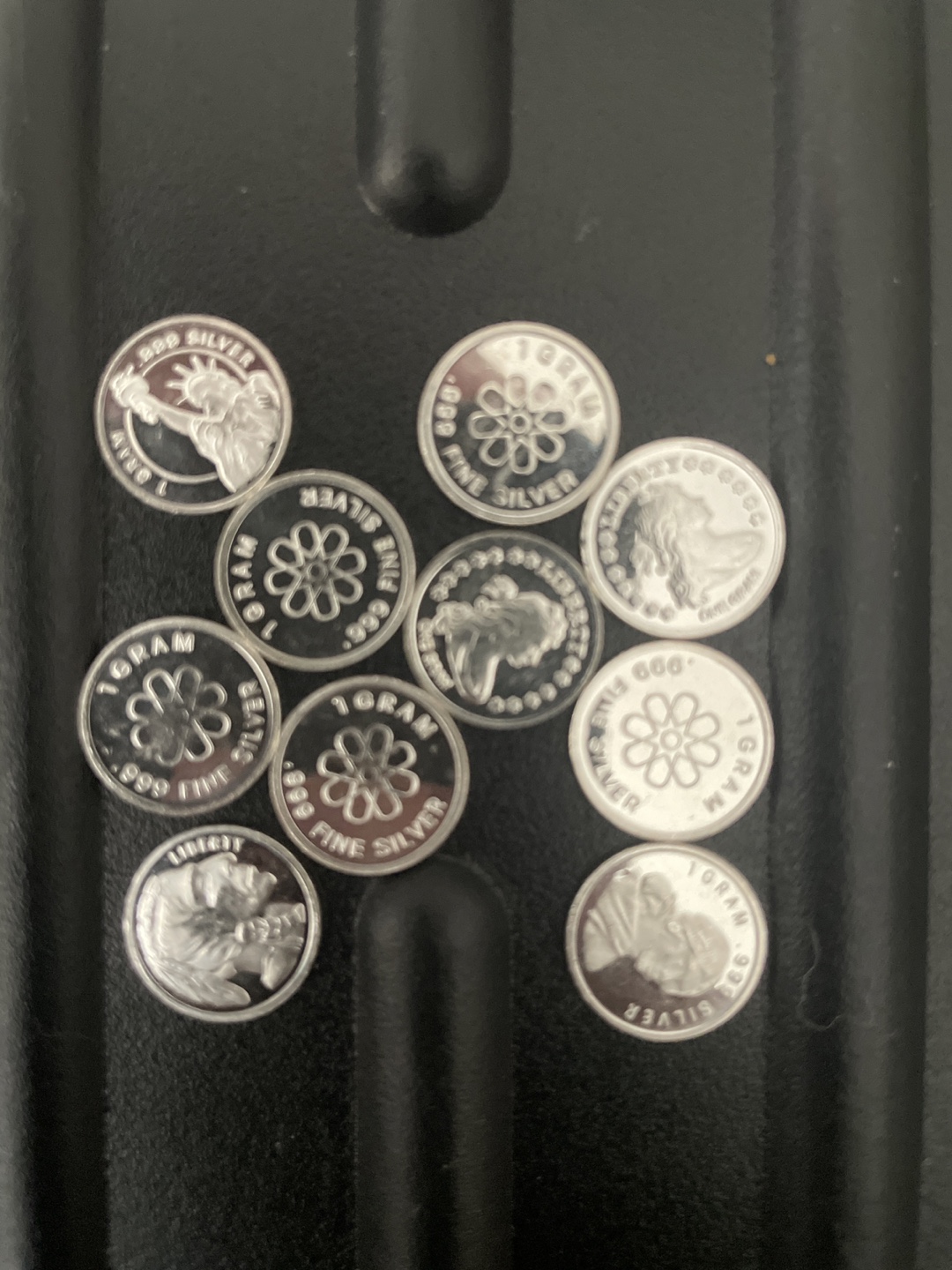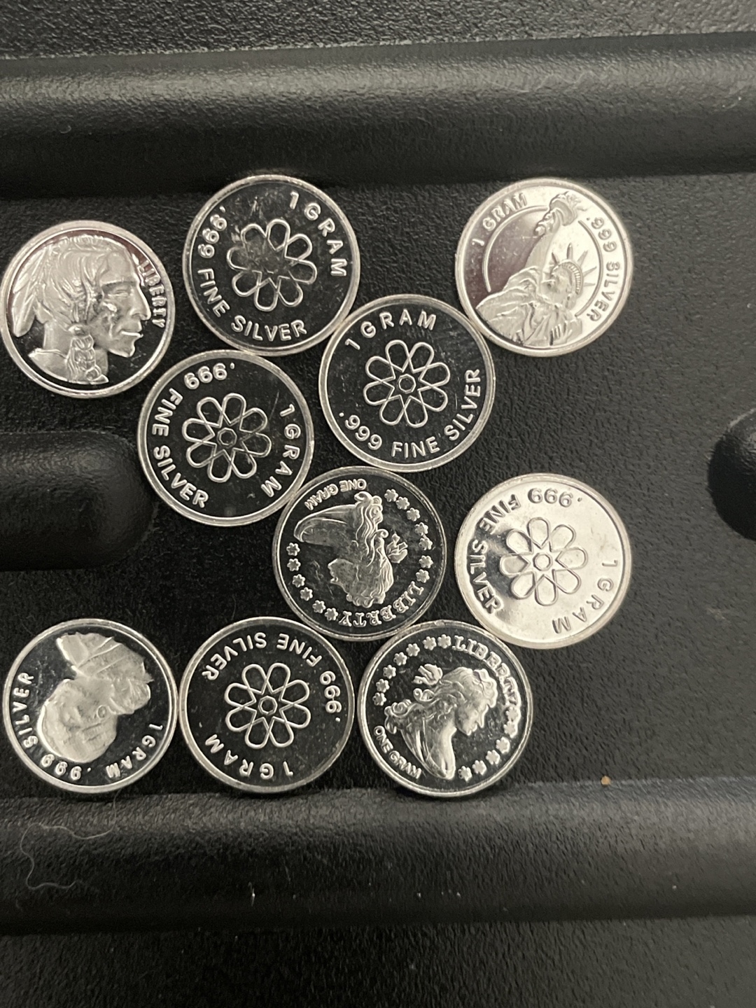 Selling a collection of ten (10) 1 gram .999 fine silver rounds. Each round features a unique design, including the Statue of Liberty, buffalo, and floral patterns. These are a great way to invest in precious metals!