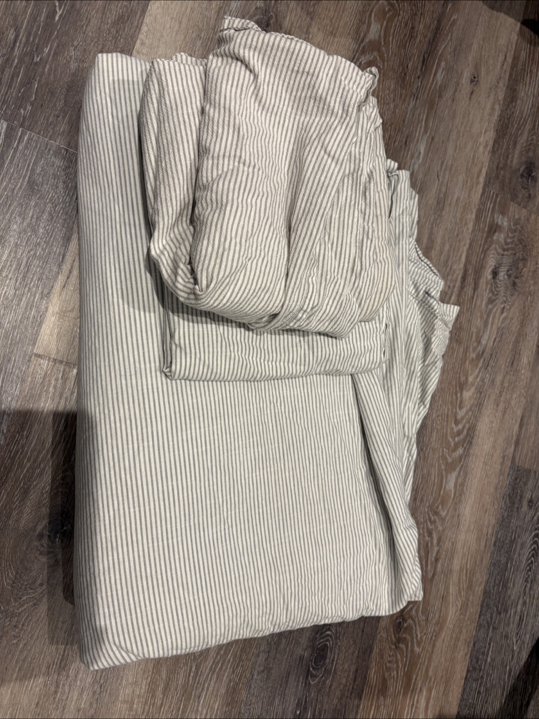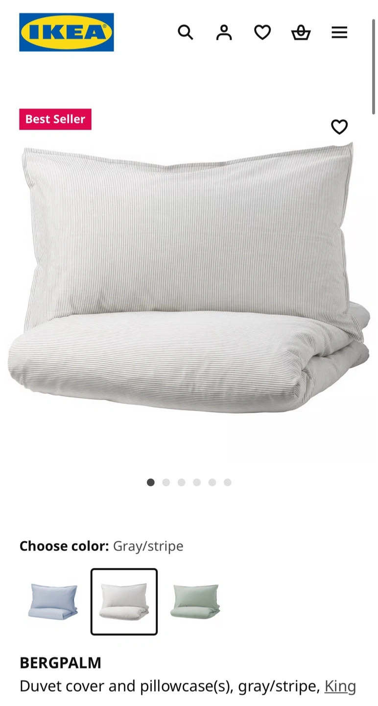 Selling a king-size duvet cover set from IKEA. It's the Bergpalm model in a gray stripe pattern. The set includes the duvet cover and pillowcase(s).I‘m keeping it after washing