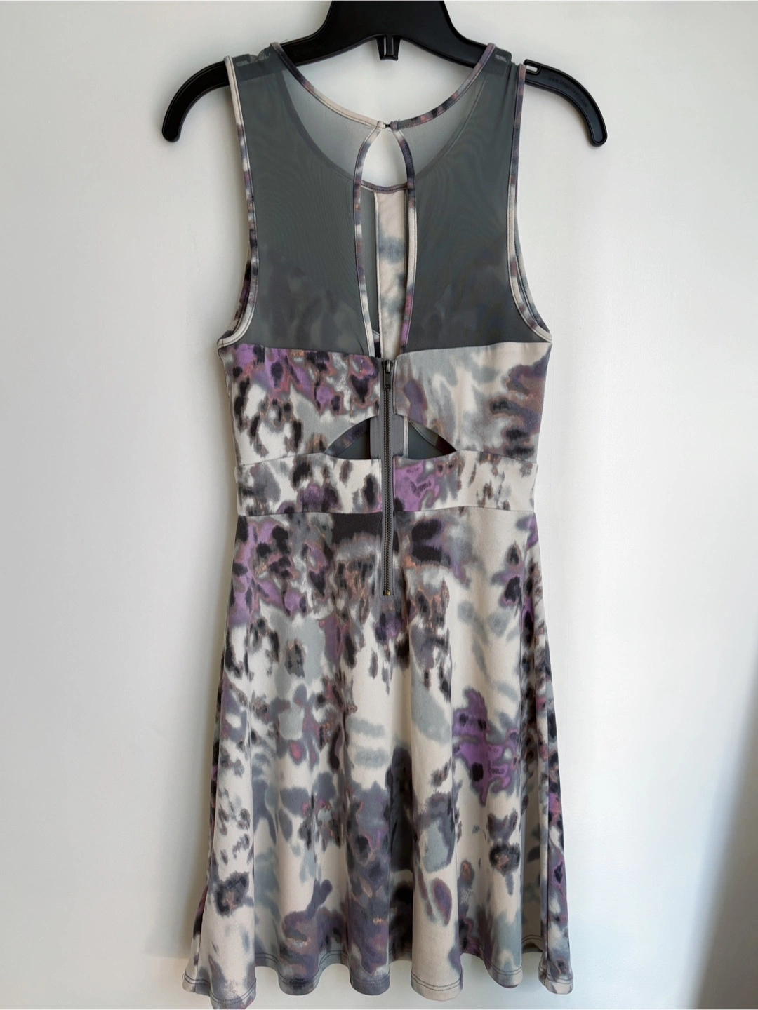 This is a lovely watercolour print mini dress. It features a mesh neckline and cutout details. Perfect for a summer day!