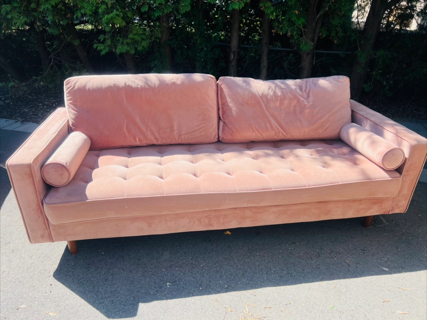 Selling a lovely pink velvet sofa! It's in great condition and would look amazing in any living room or den. The cushions are plush and comfortable, perfect for lounging. It features a button-tufted design and comes with two bolster pillows. It's a stylish and cozy piece of furniture!