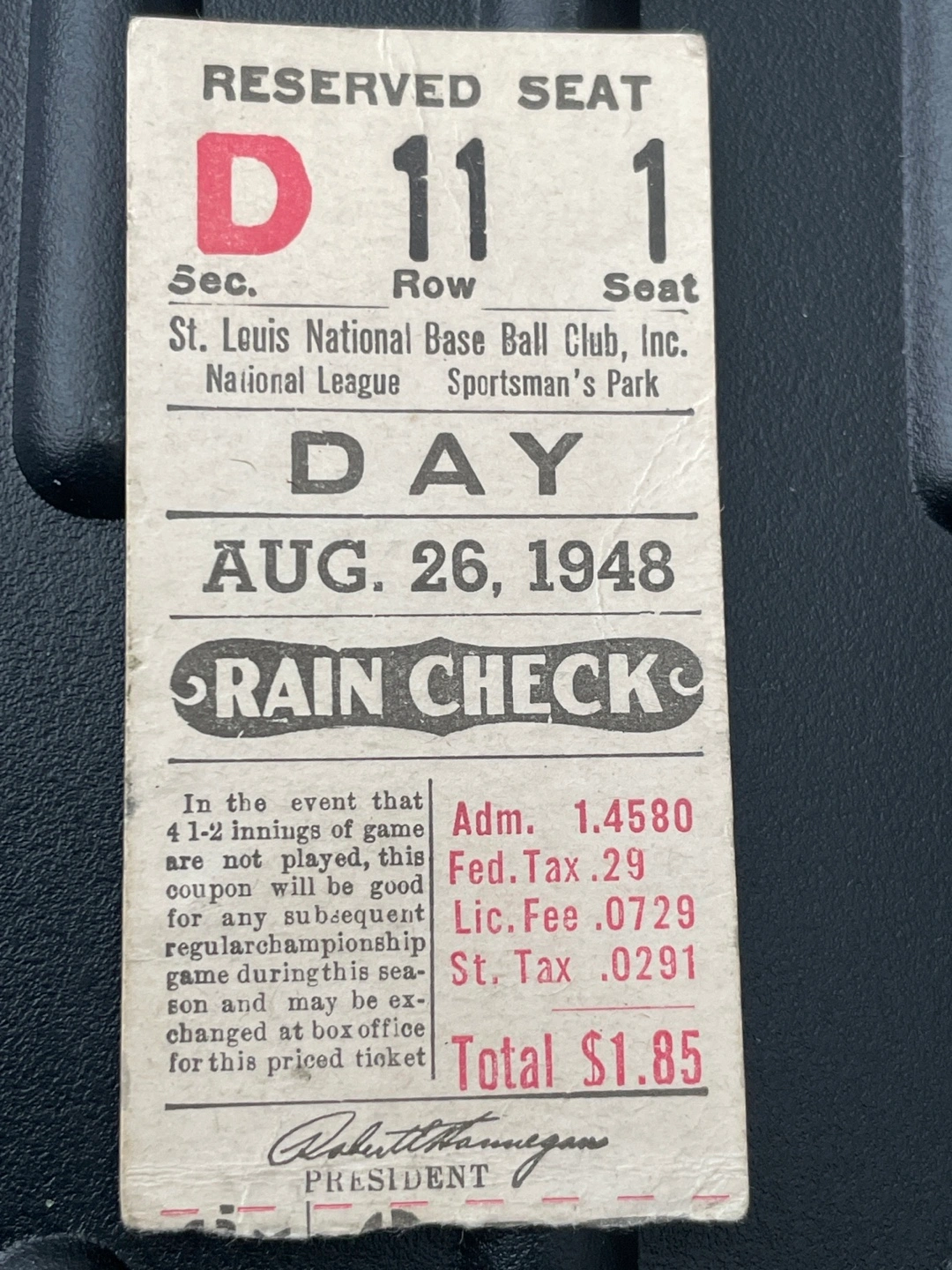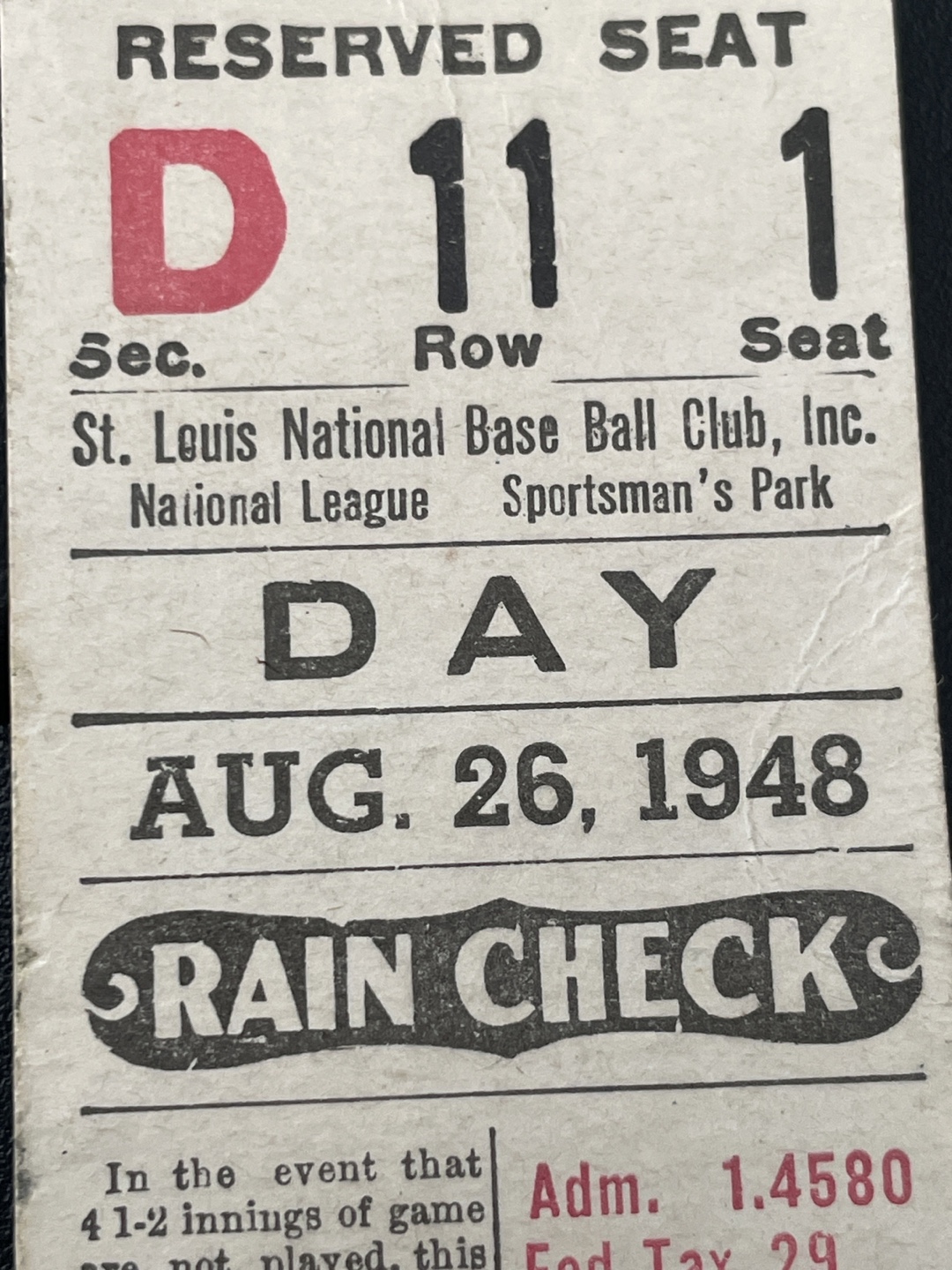 Selling a vintage reserved seat ticket from a St. Louis National Base Ball Club game at Sportsman's Park. The ticket is for a day game on August 26, 1948. It also includes a rain check. A cool piece of baseball history!
