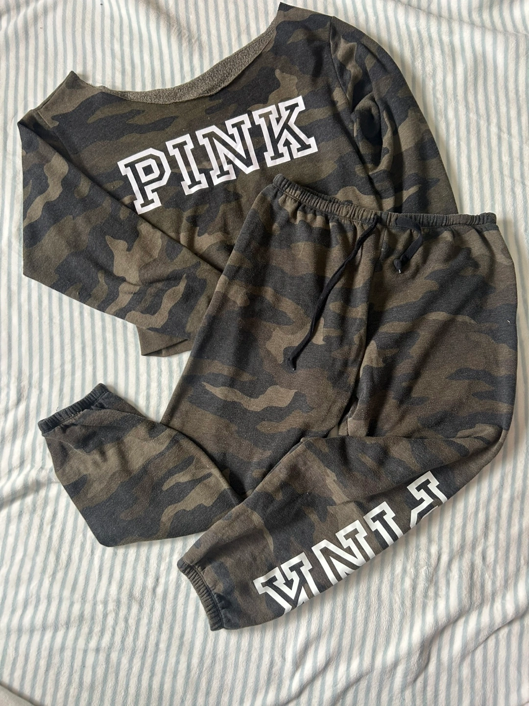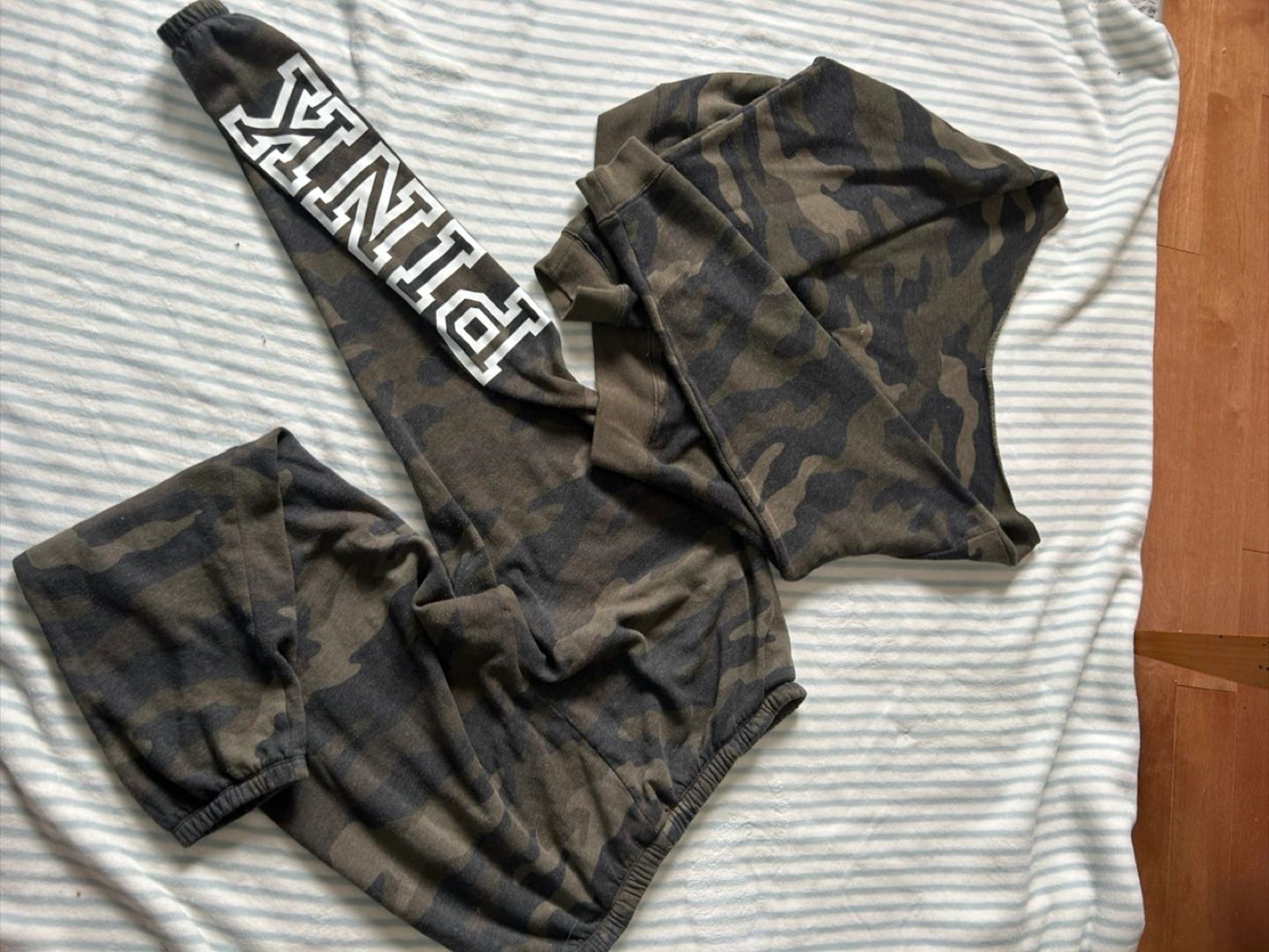 Selling a PINK lounge set with a camo print. The set includes a long-sleeve top and matching pants. It's super comfy and perfect for lounging around the house!