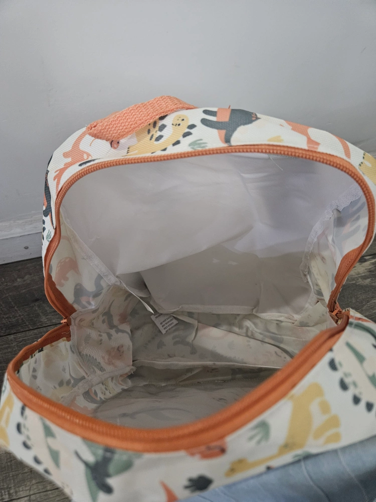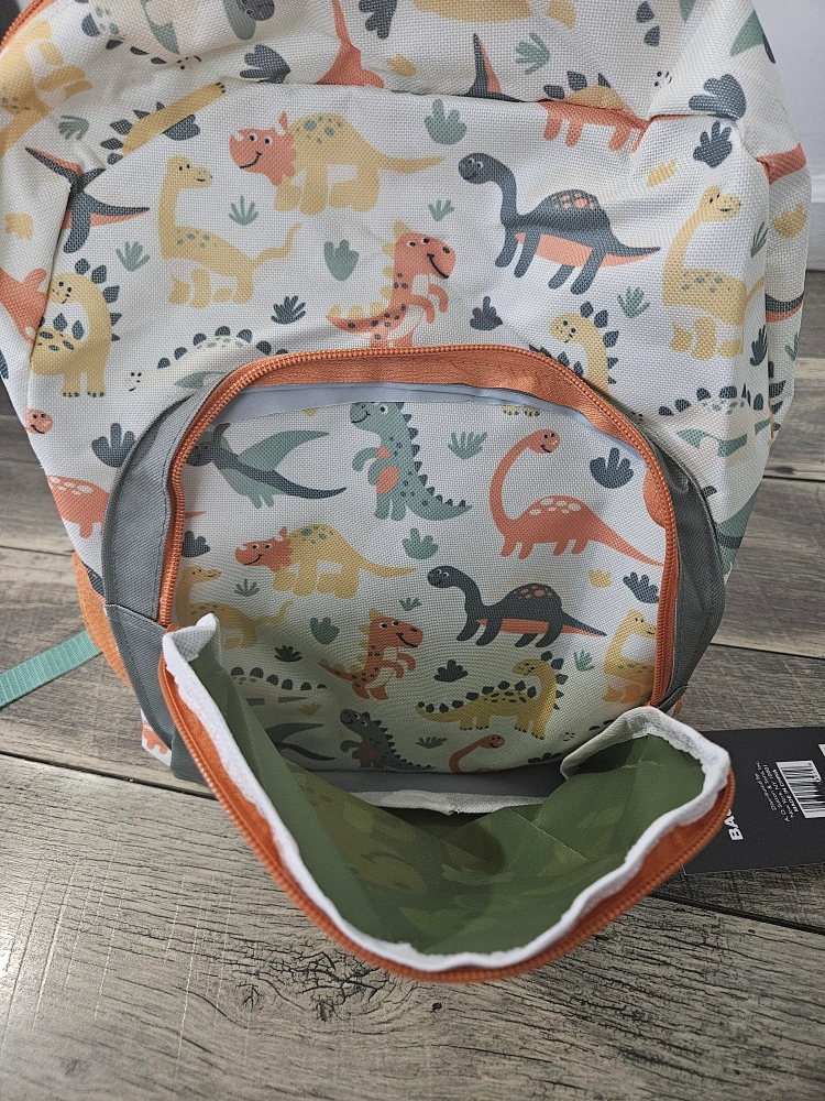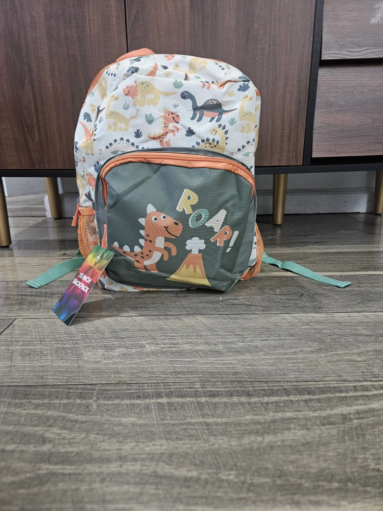 This adorable 15-inch backpack features a fun dinosaur print! It's perfect for kids and has a front pocket with a cute dinosaur and volcano design that says "ROAR!" you can only buy minimum 2.