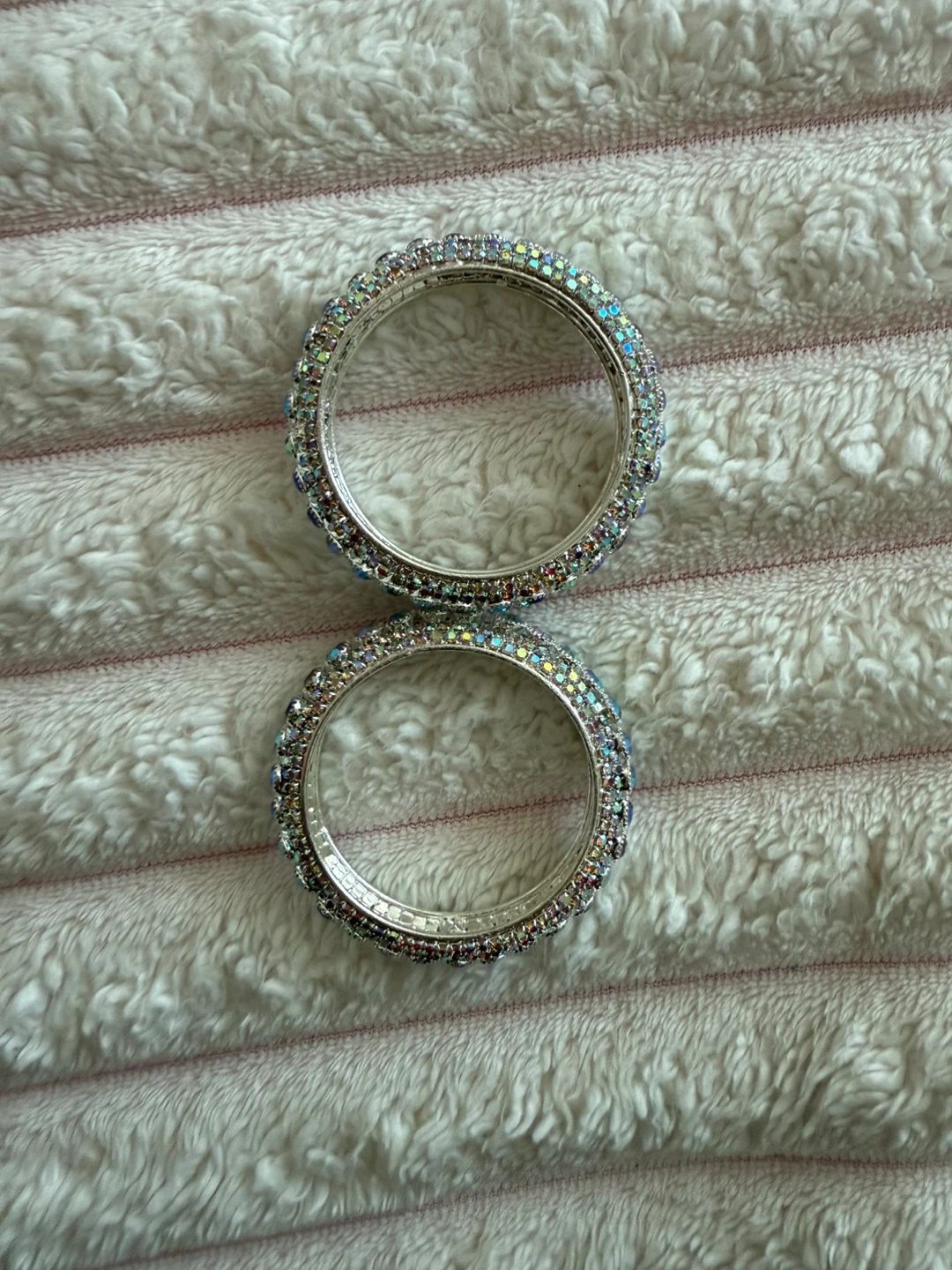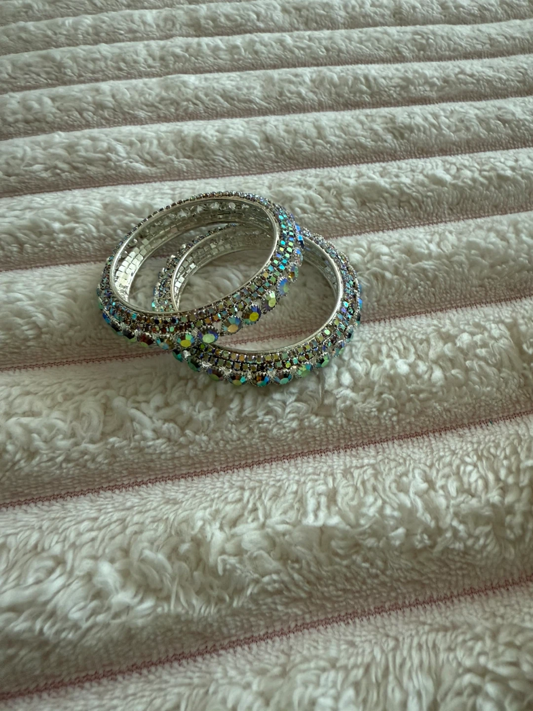 Here's a set of two sparkly bangles! They are decorated with rhinestones that catch the light beautifully. These were never used before and were given as a gift. These are suitable for toddlers or children.
