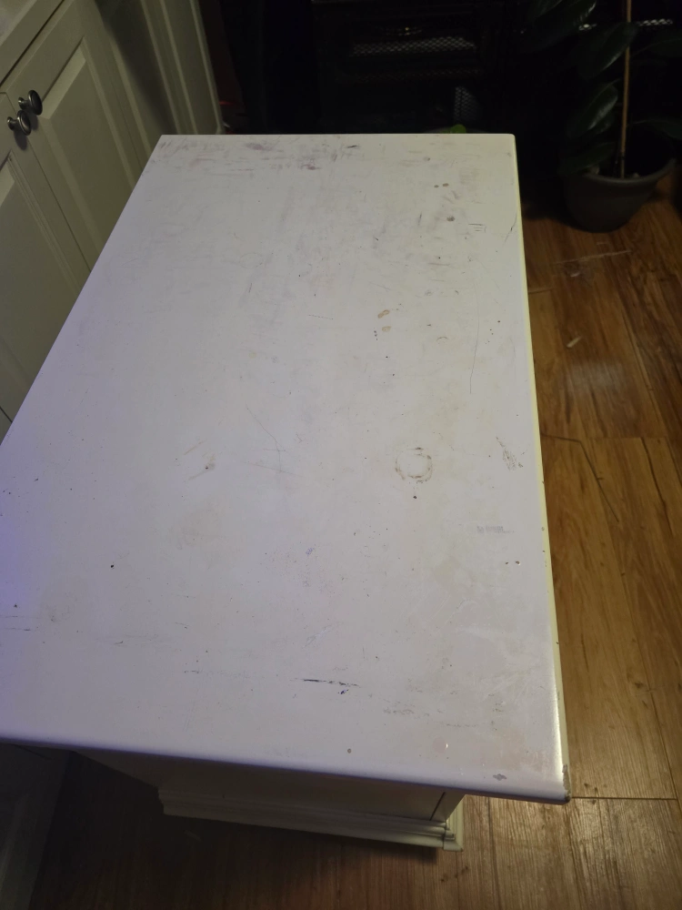 Here's a charming white side table, perfect for adding a touch of classic style to your bedroom or living room! It features a convenient drawer and a cabinet for extra storage. It has some signs of use, but it's still sturdy and functional