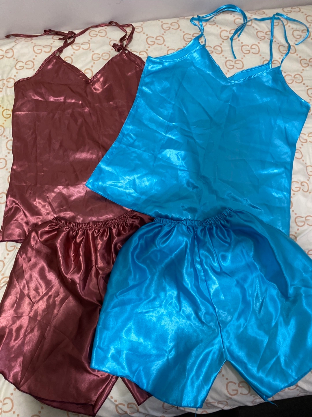 Here's a comfy 2 satin pajama set! The set includes a camisole top and shorts. Perfect for a cozy night's sleep or lounging around the house