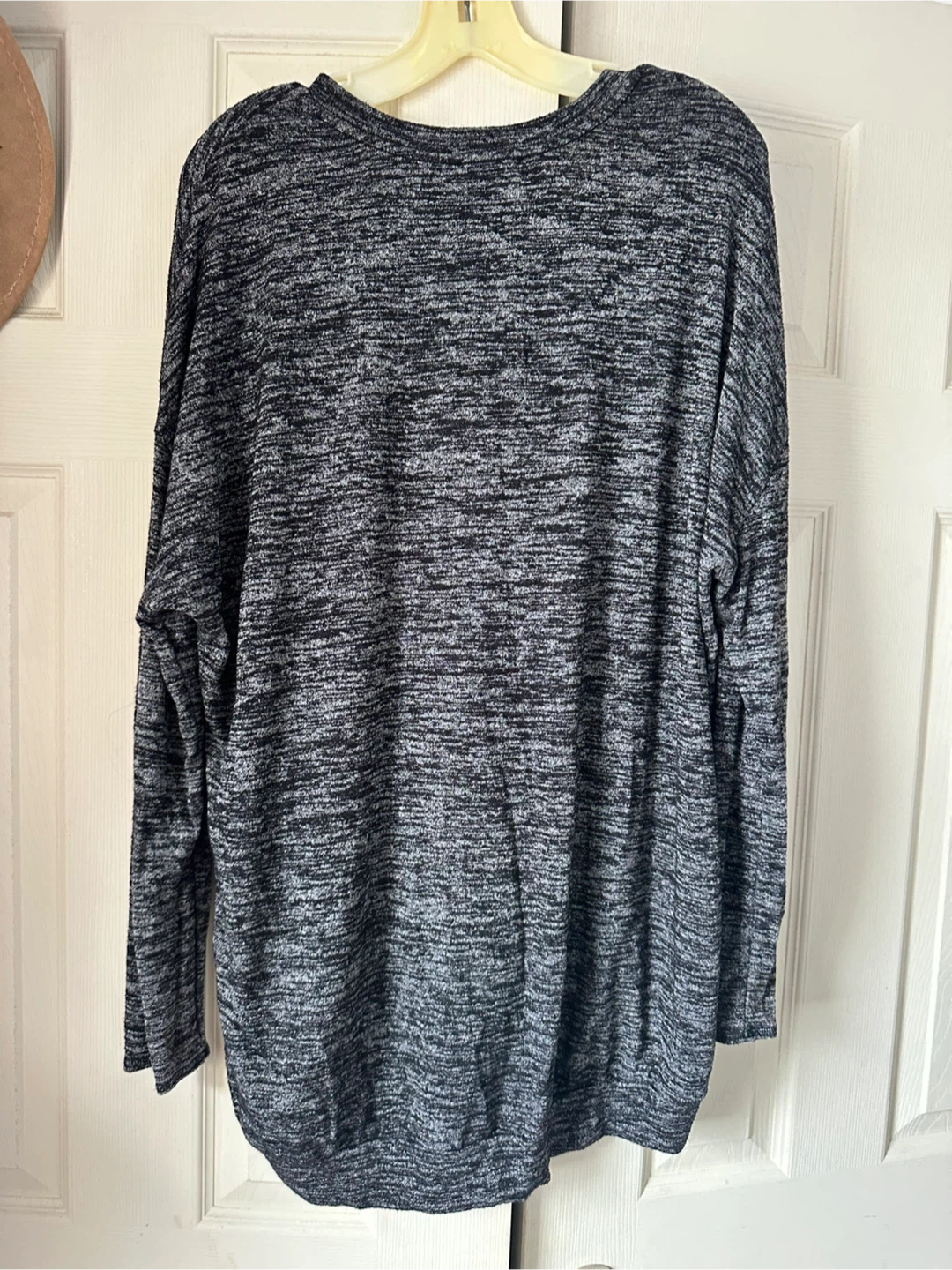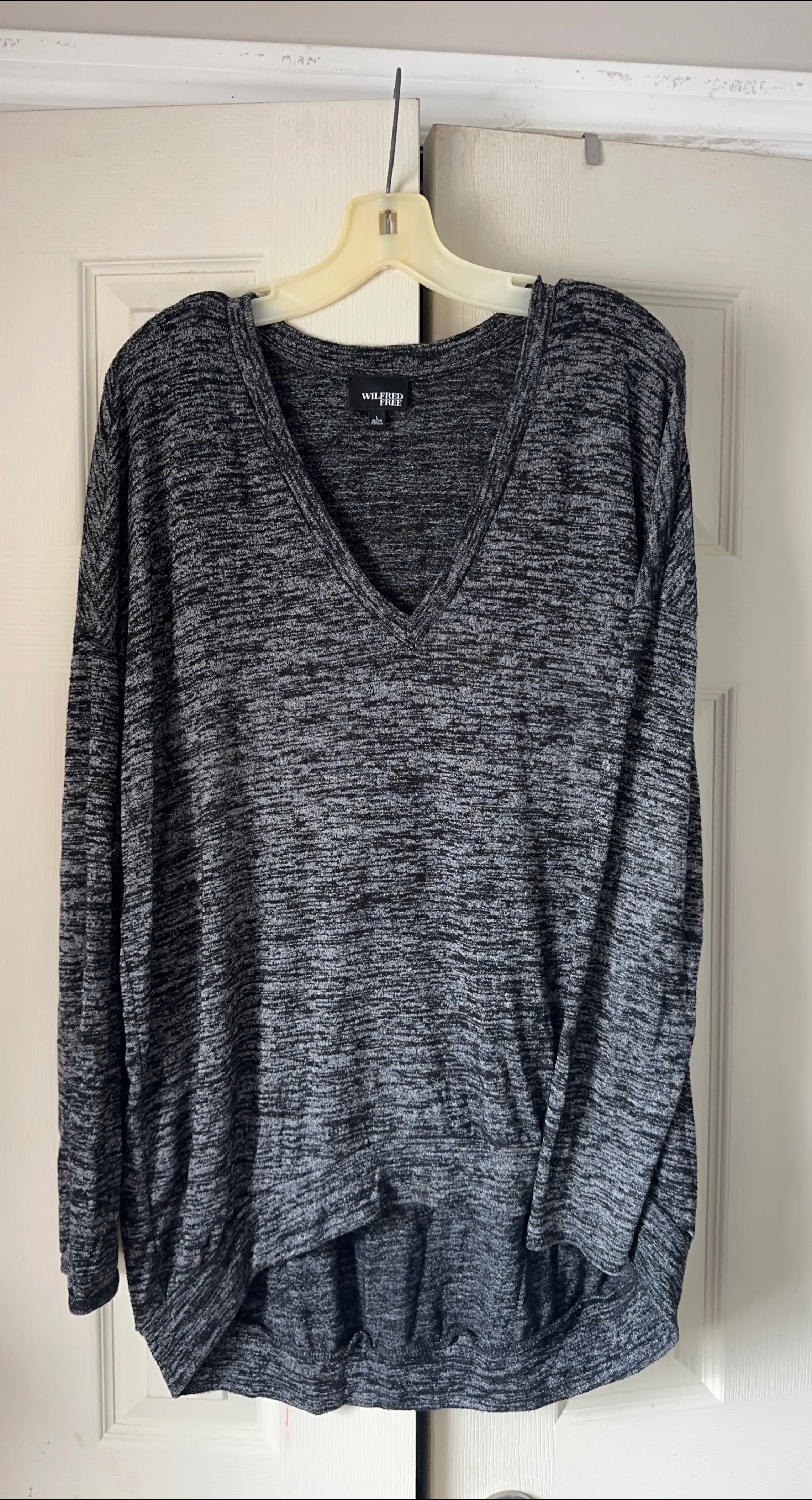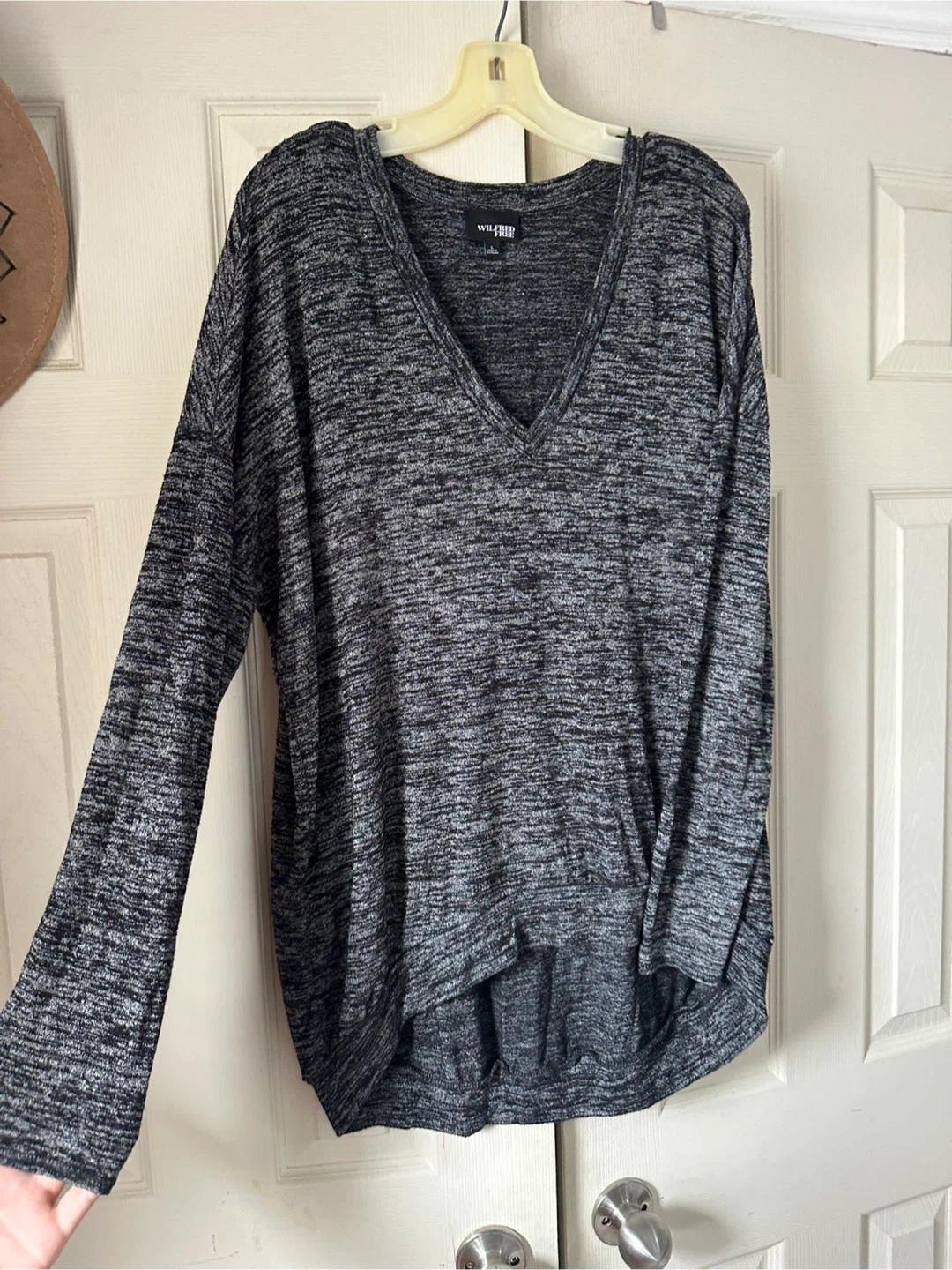 Cozy Wilfred Free sweater in a stylish black and grey marled knit! This V-neck sweater is a size large and perfect for layering or wearing on its own. It's in great condition and ready for a new home