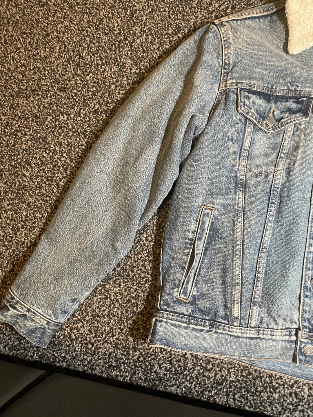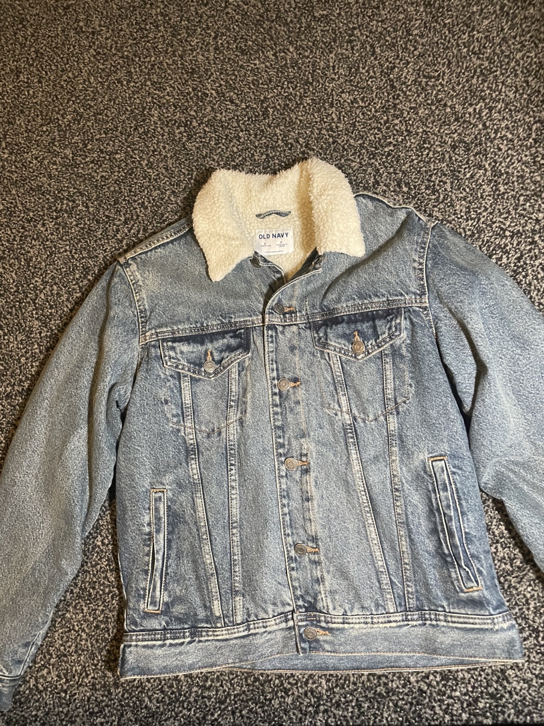 Cozy up in this Old Navy denim jacket! It's a size small and features a comfy sherpa lining. Perfect for adding a touch of warmth and style to your outfit. Goes for around 42-85 dollars on old navy which is currently all sold out. Jacket is in good condition