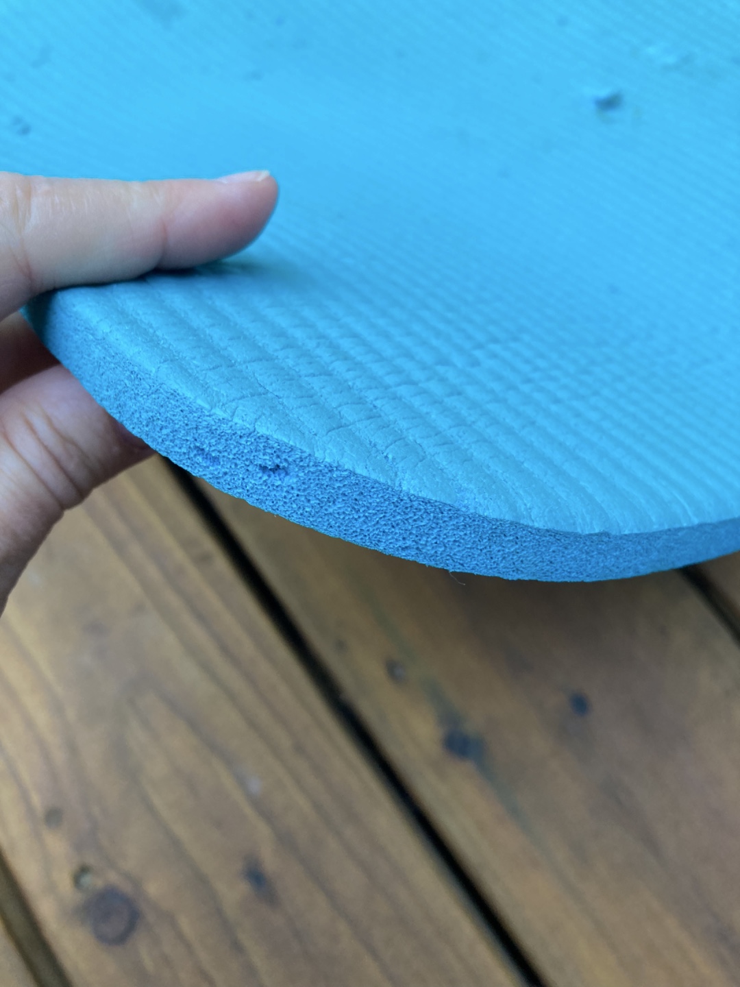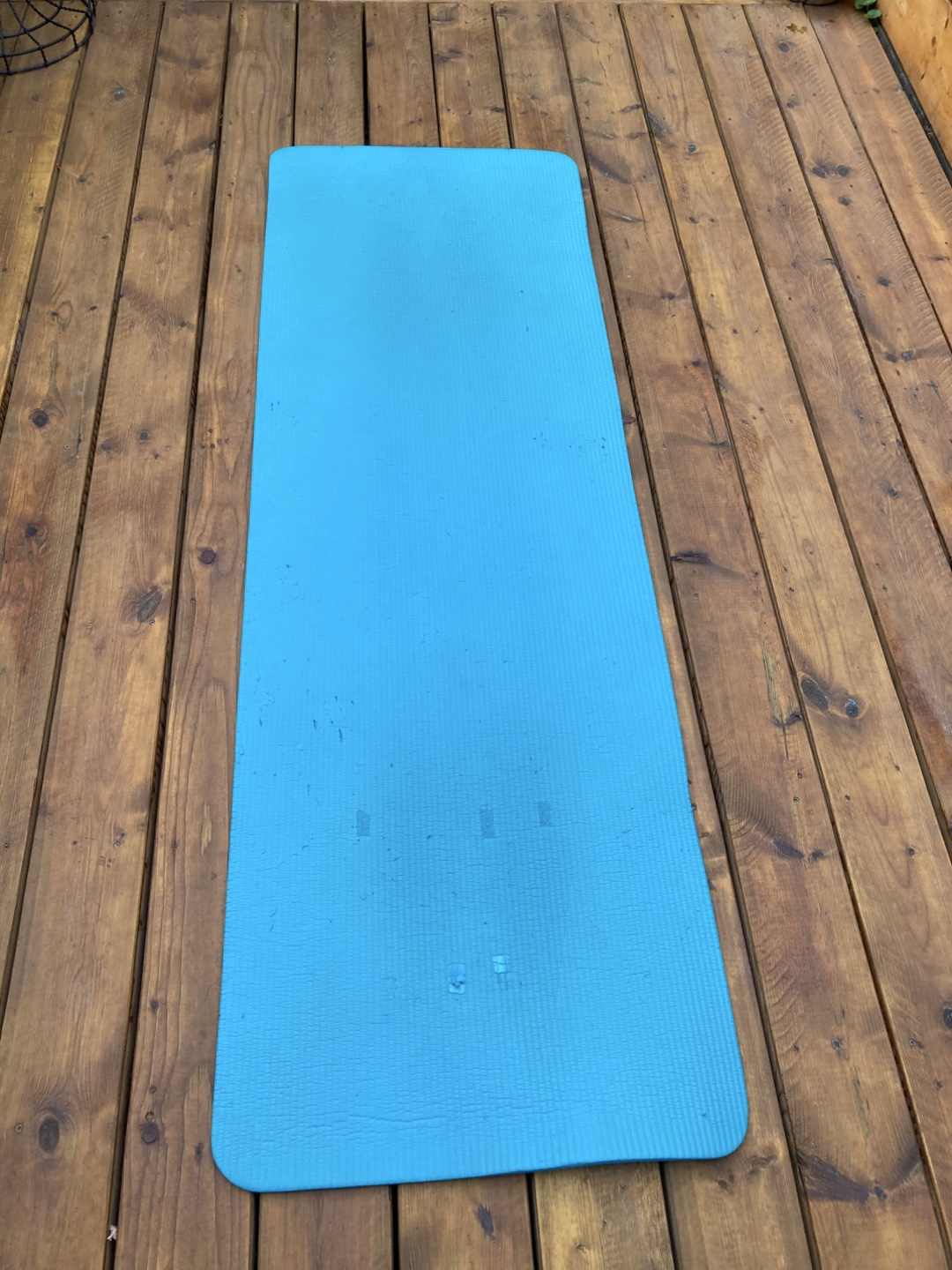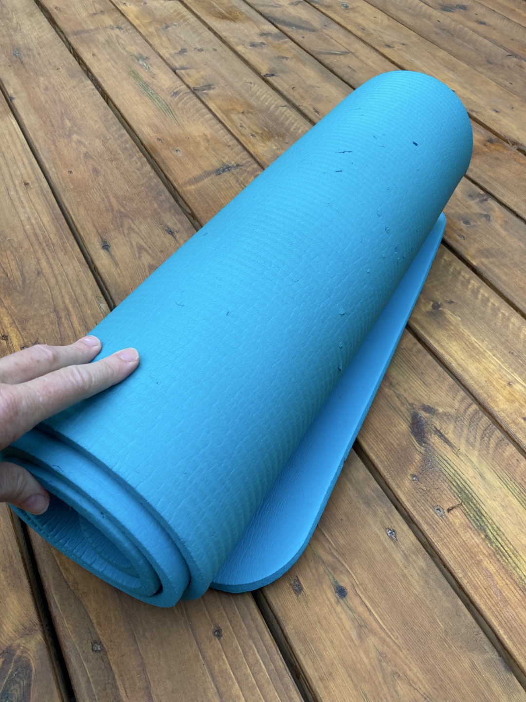 Here's a blue roll mat, perfect for either sleeping on while camping or for your at-home workouts or stretching sessions! It's in reasonable condition and ready for a new home. Lightweight and easy to roll up for storage.