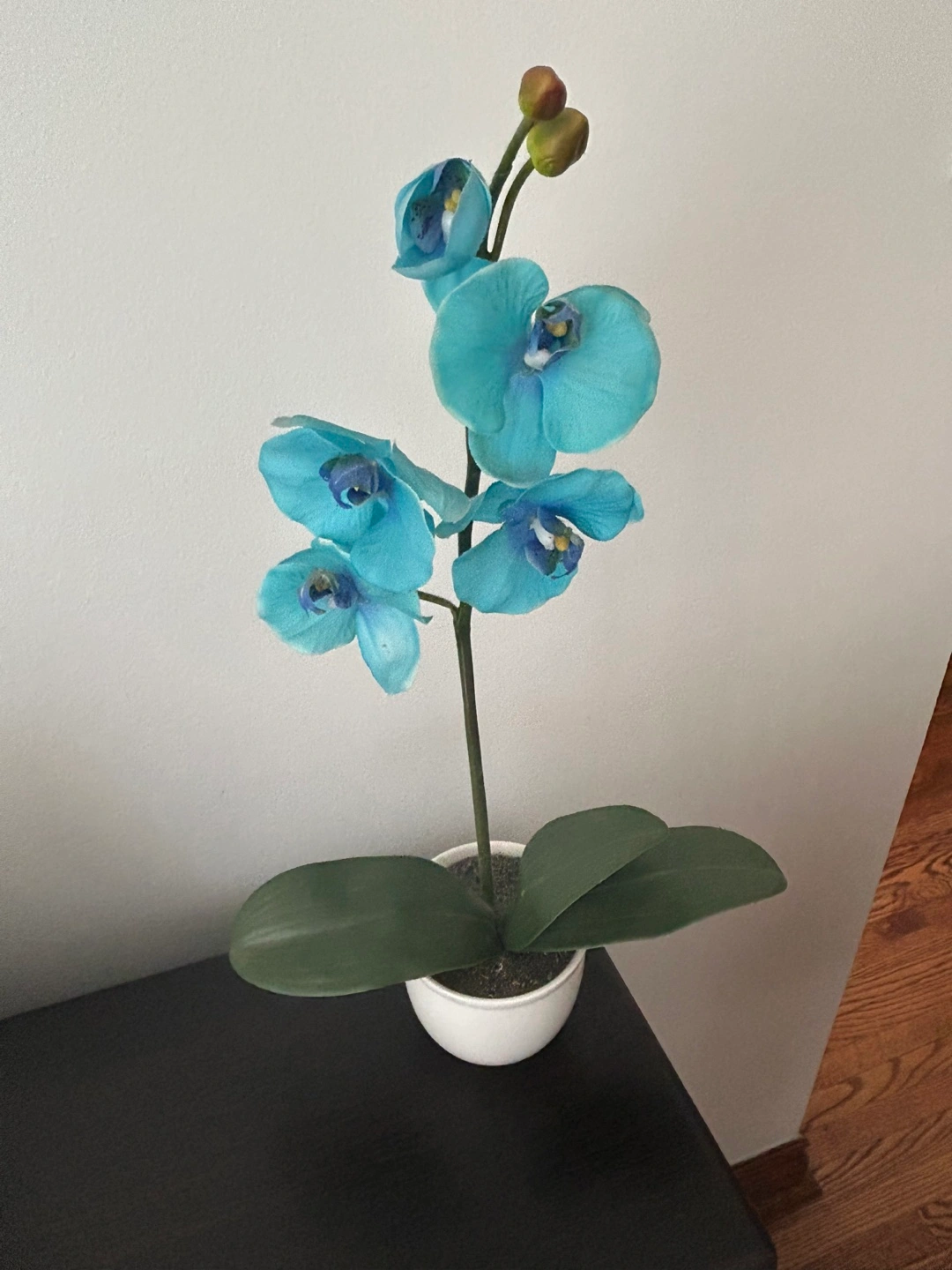 A pretty artificial blue orchid in a white pot. It's perfect for adding a touch of colour to any room, no chips no cracks on the pot