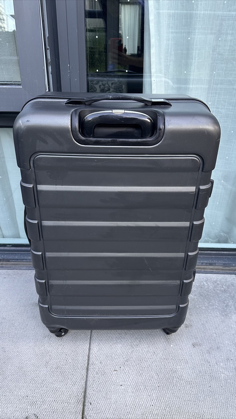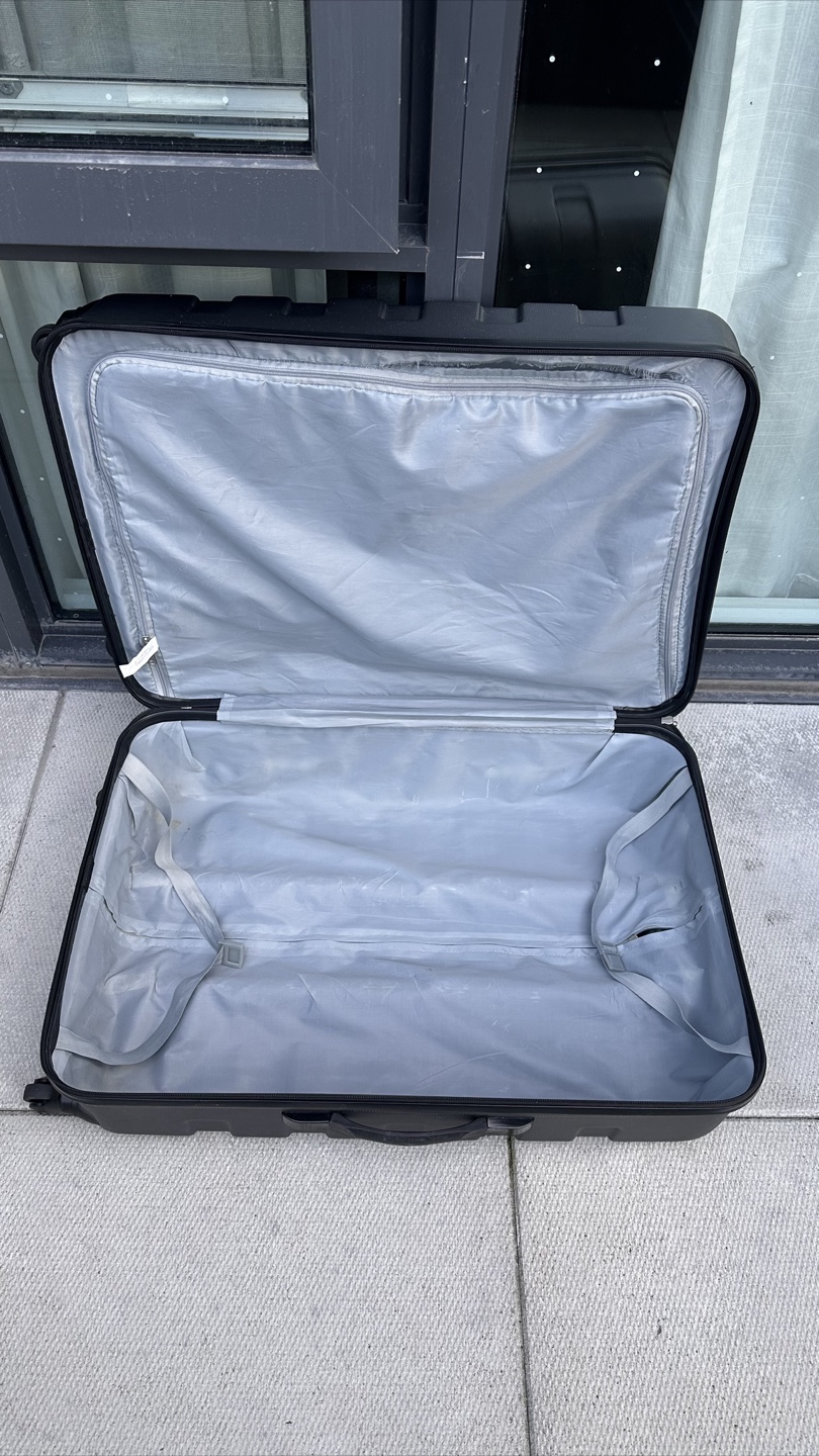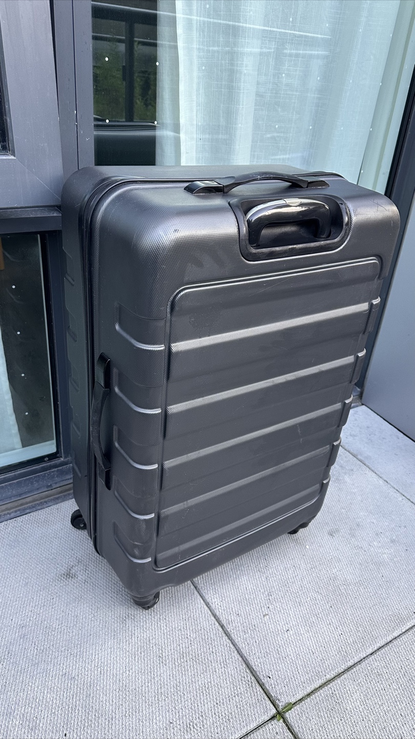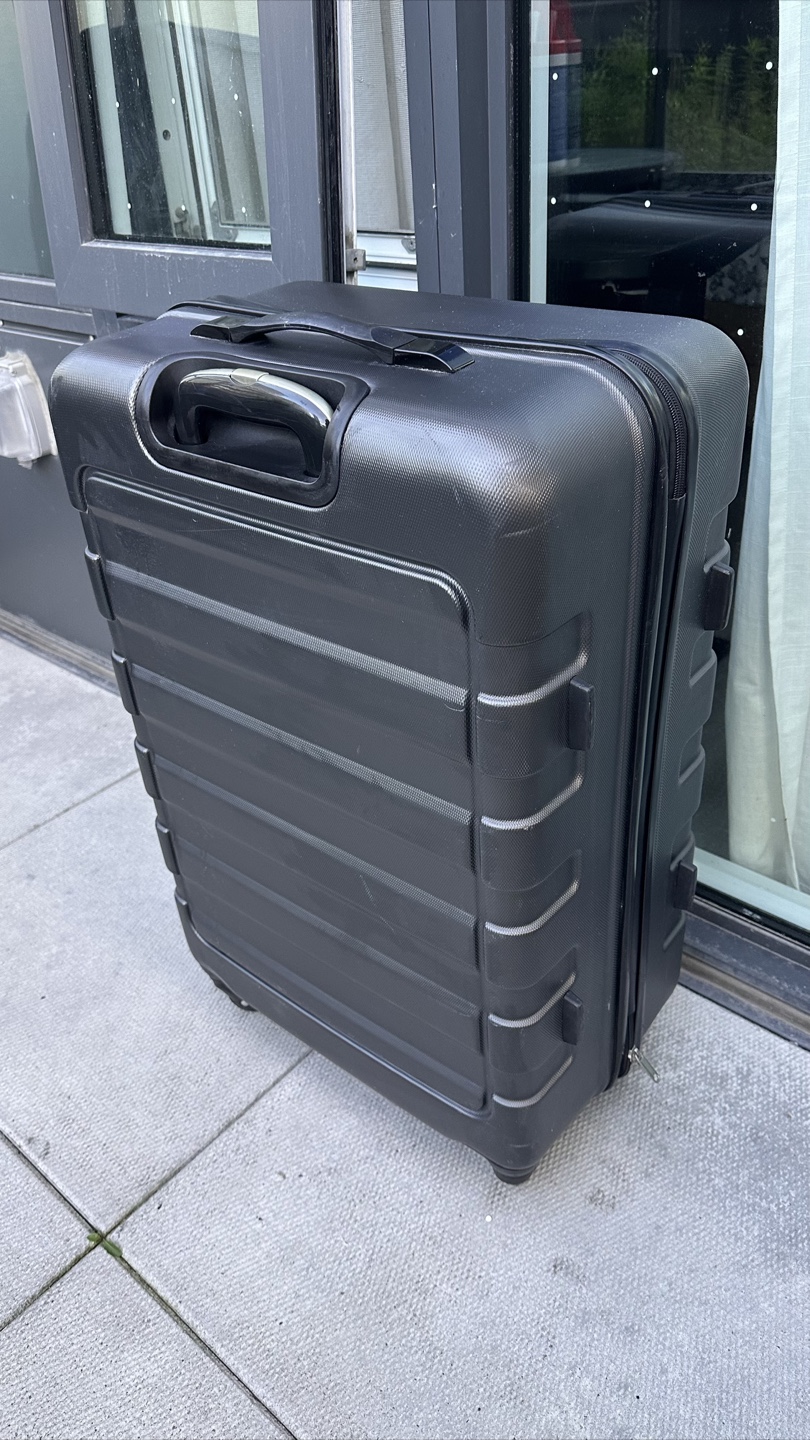 Large hardside 4-wheel luggage in good condition. It has a small crack on the side and wear and tear inside, but otherwise still great for travelling. Luggage is lightweight and wheels run smoothly.