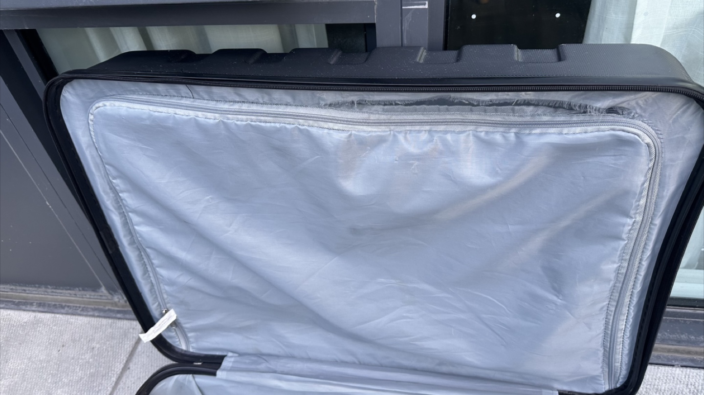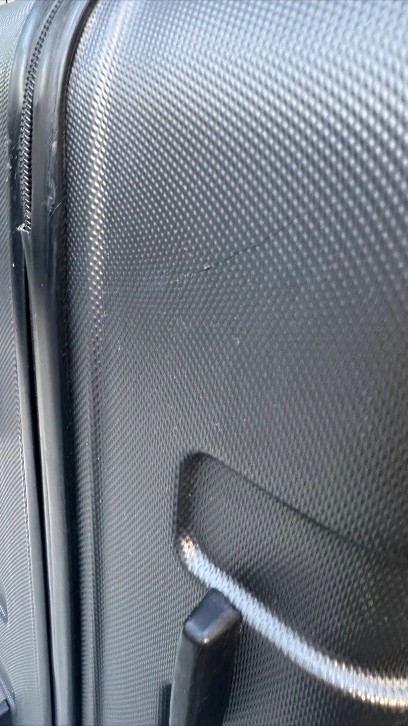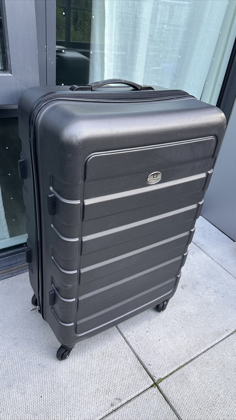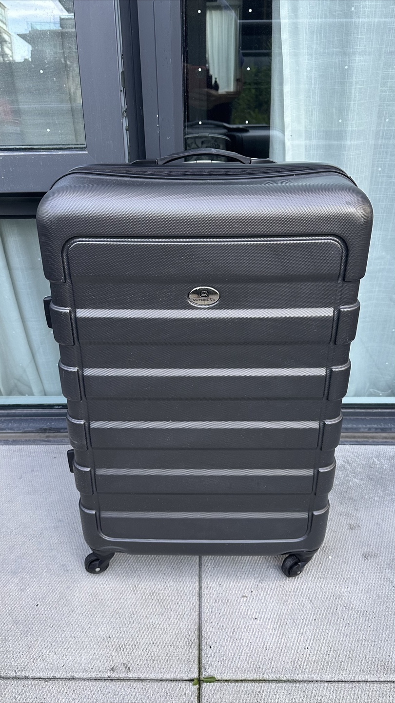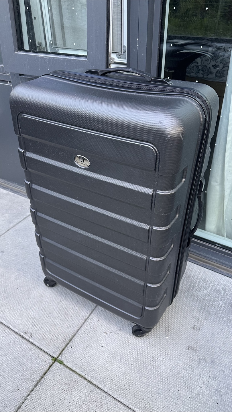 Large hardside 4-wheel luggage in good condition. It has a small crack on the side and wear and tear inside, but otherwise still great for travelling. Luggage is lightweight and wheels run smoothly.