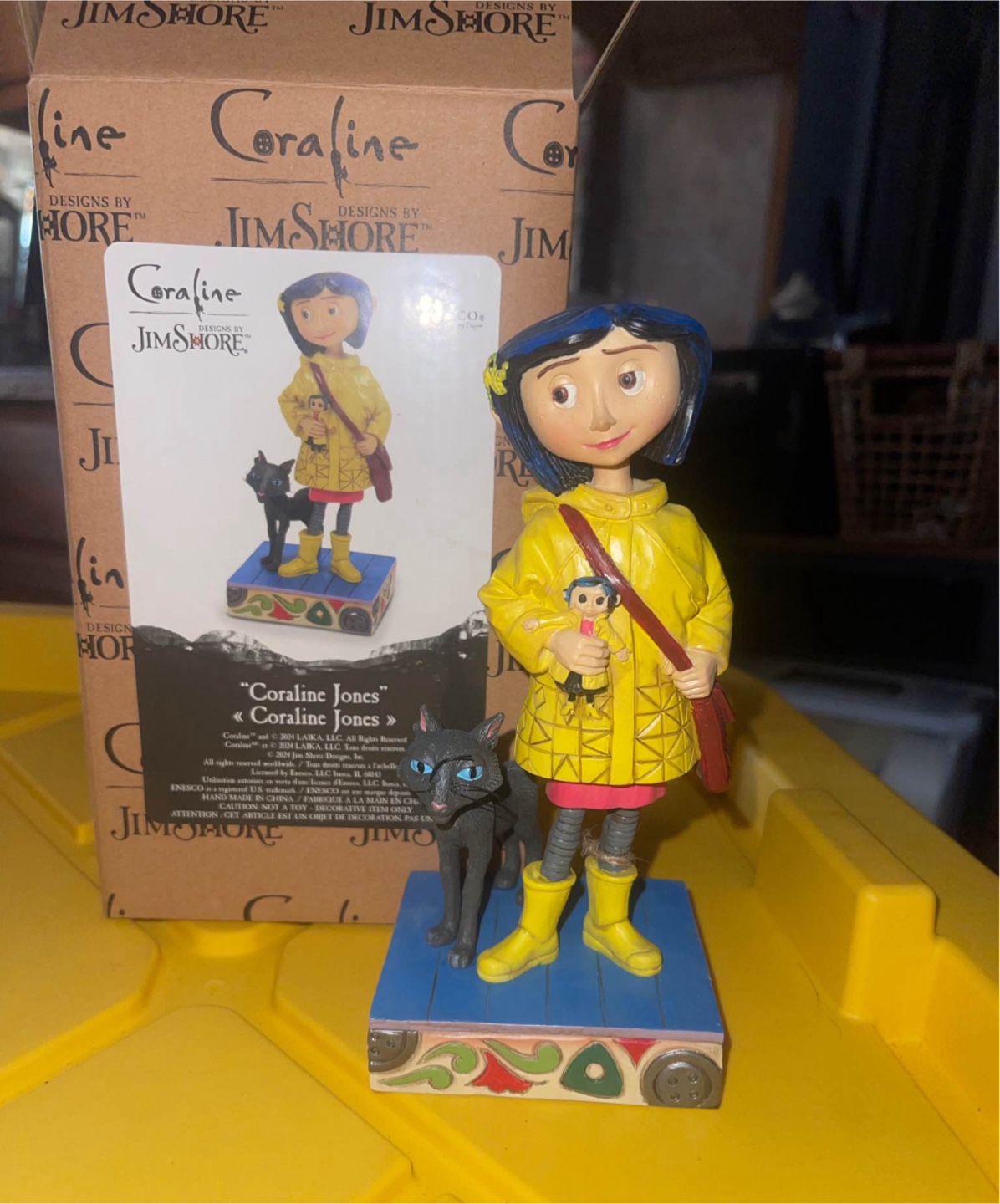 This is a Jim Shore figurine of Coraline Jones with the cat from Coraline. It comes with the original box. The figurine is a decorative item only.