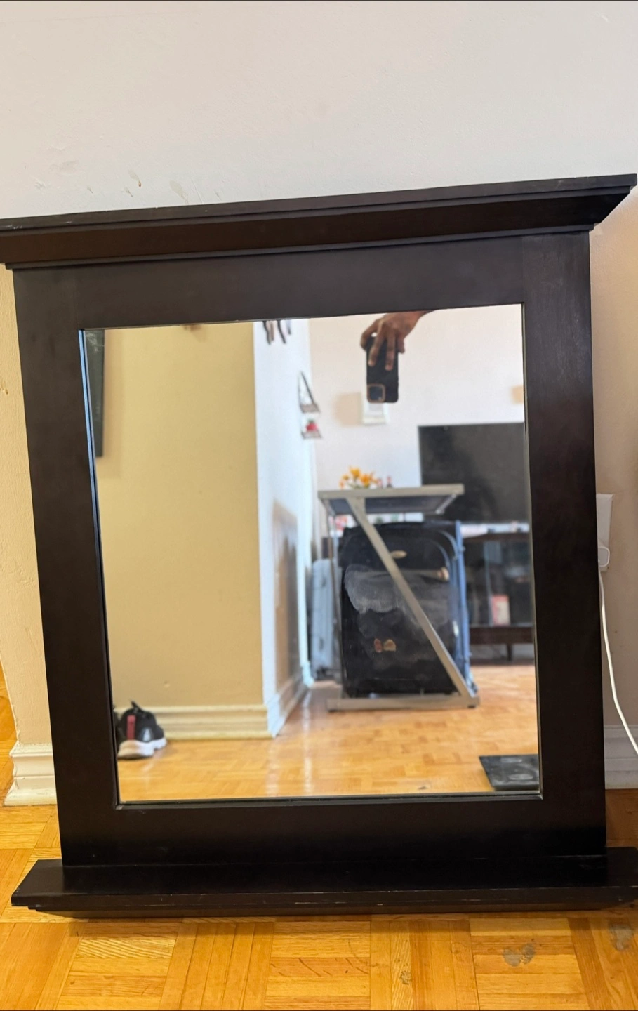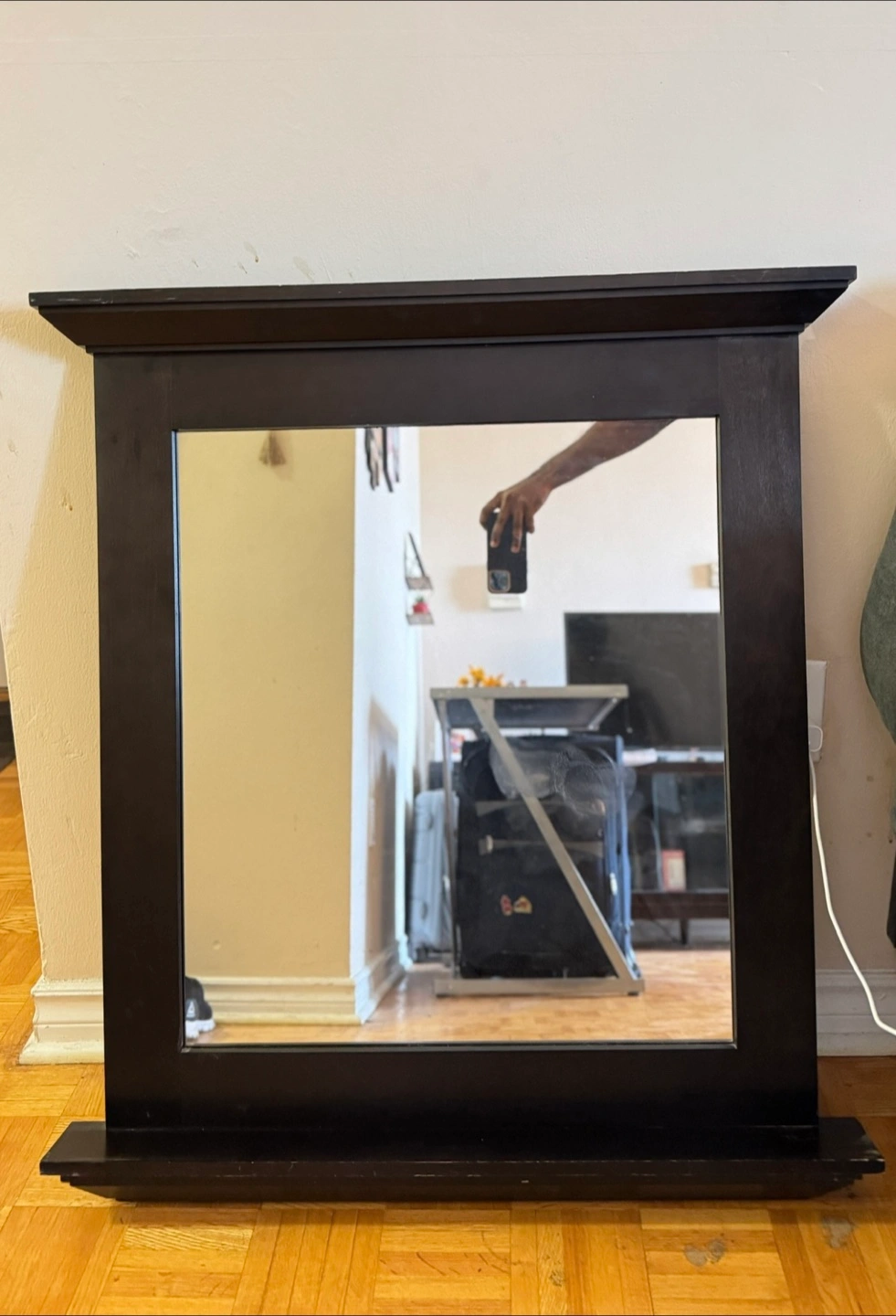 Selling a dark brown framed wall mirror. It's in great condition and would look lovely in any room. The mirror has a simple, classic design that would complement a variety of decor styles. It's ready to be hung and brighten up your space!
