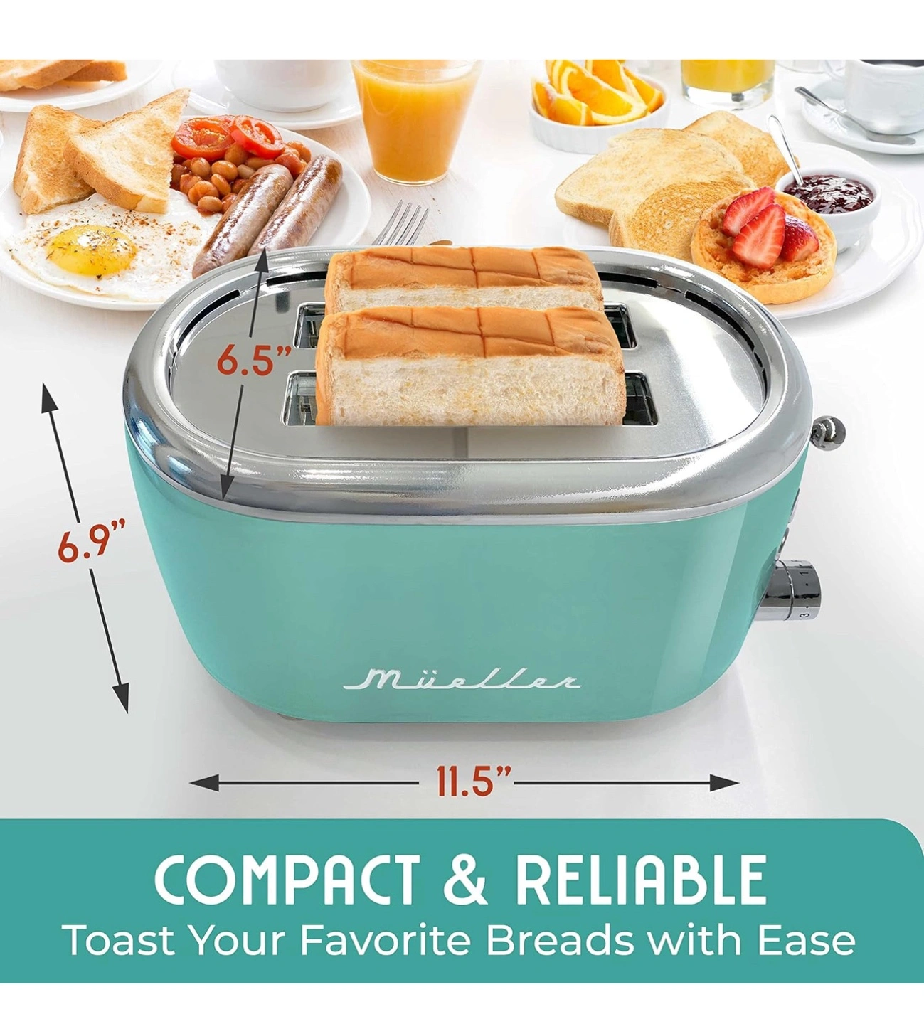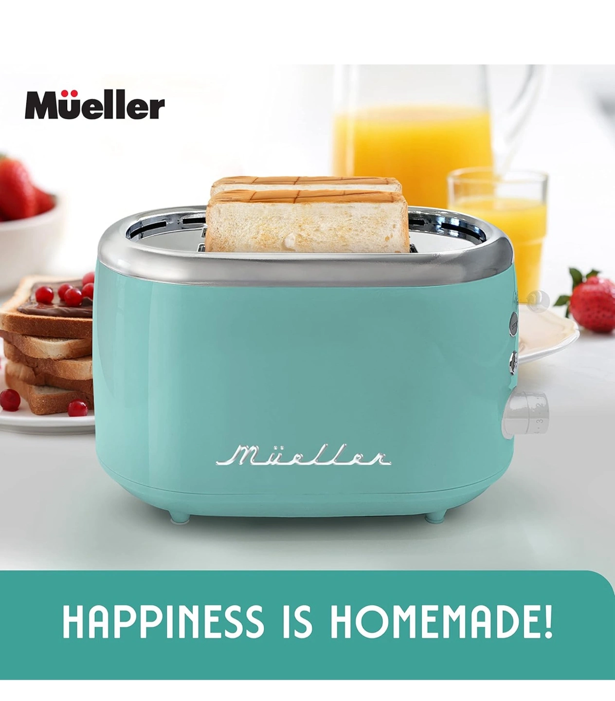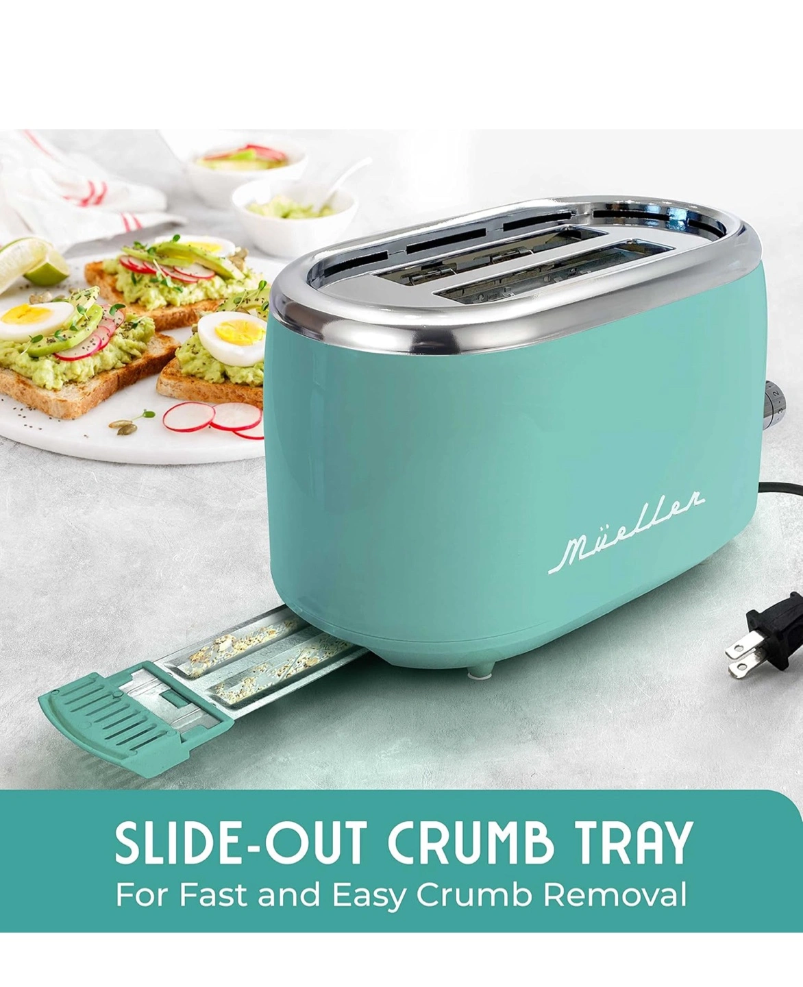 Selling a Mueller Home Retro 2-Slice Toaster in turquoise! This toaster has 7 browning levels and 3 functions: reheat, defrost, and cancel. It also features a removable crumb tray and under-base cord storage. Compact and reliable, it makes toasting your favorite breads easy! Dimensions are 6.9" x 11.5" x 6.5".