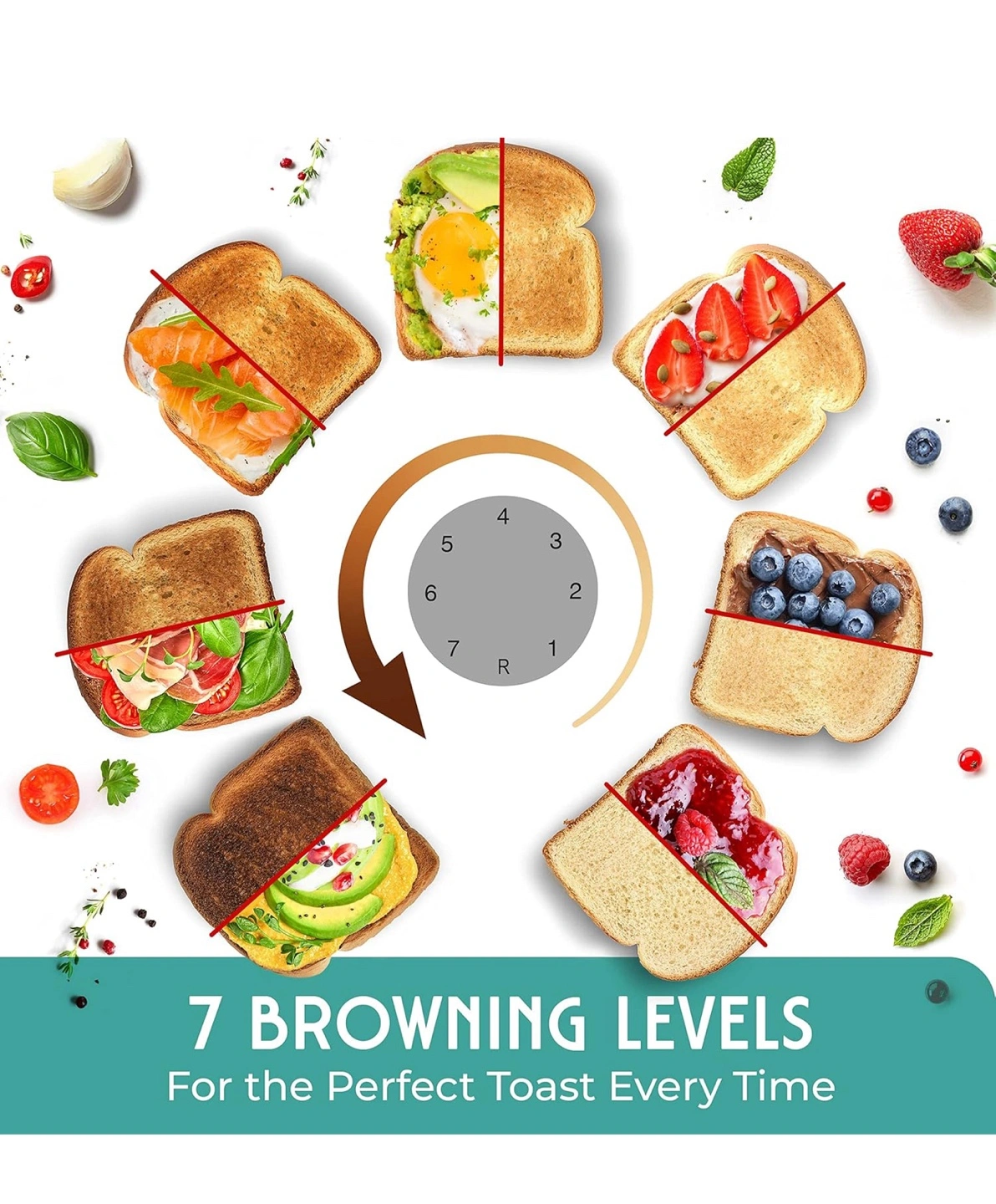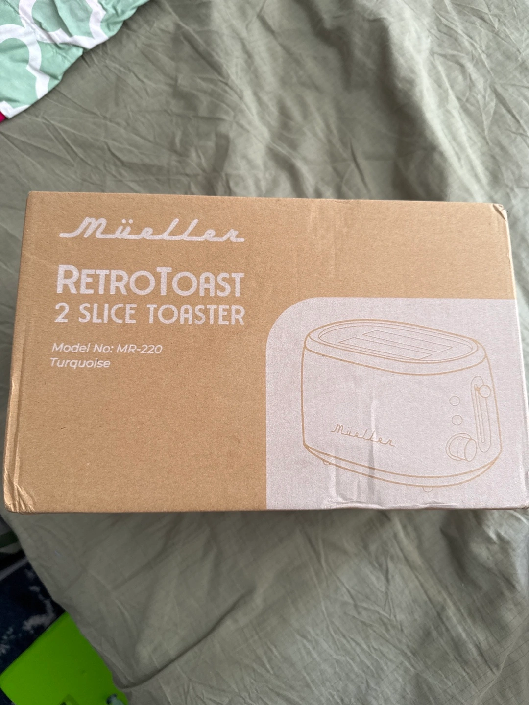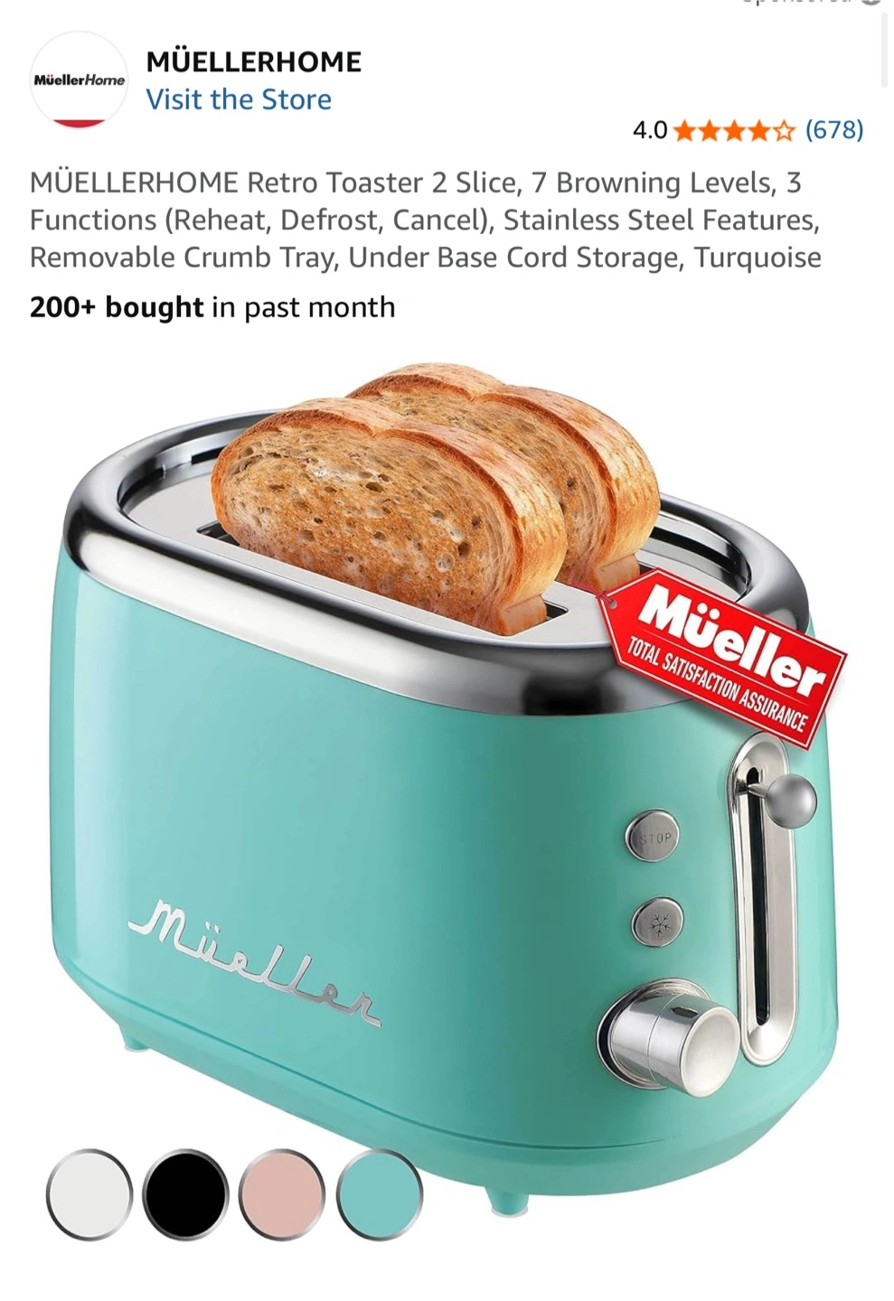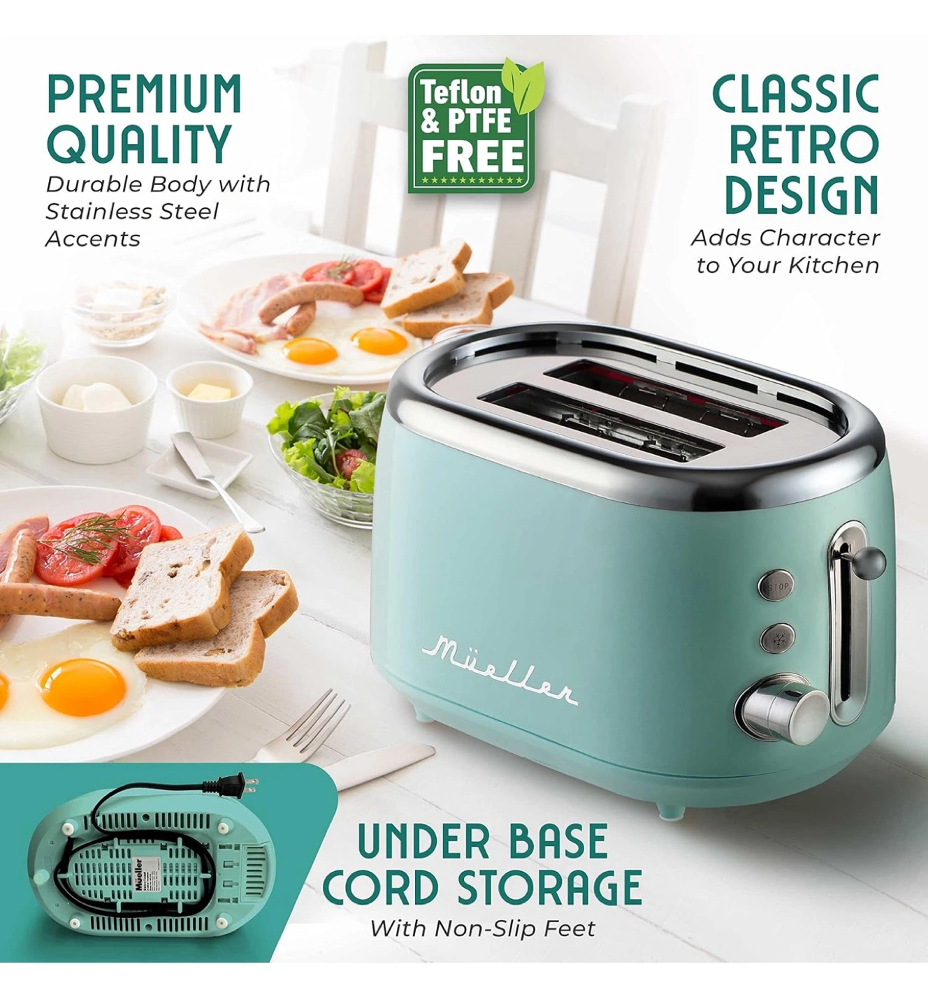 Selling a Mueller Home Retro 2-Slice Toaster in turquoise! This toaster has 7 browning levels and 3 functions: reheat, defrost, and cancel. It also features a removable crumb tray and under-base cord storage. Compact and reliable, it makes toasting your favorite breads easy! Dimensions are 6.9" x 11.5" x 6.5".