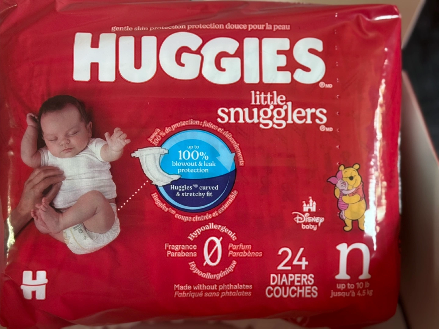 I'm selling a pack of Huggies Little Snugglers diapers. This pack contains 24 diapers for babies up to 10 lbs (4.5 kg). I have 3 packs. Pick up is Casselman area