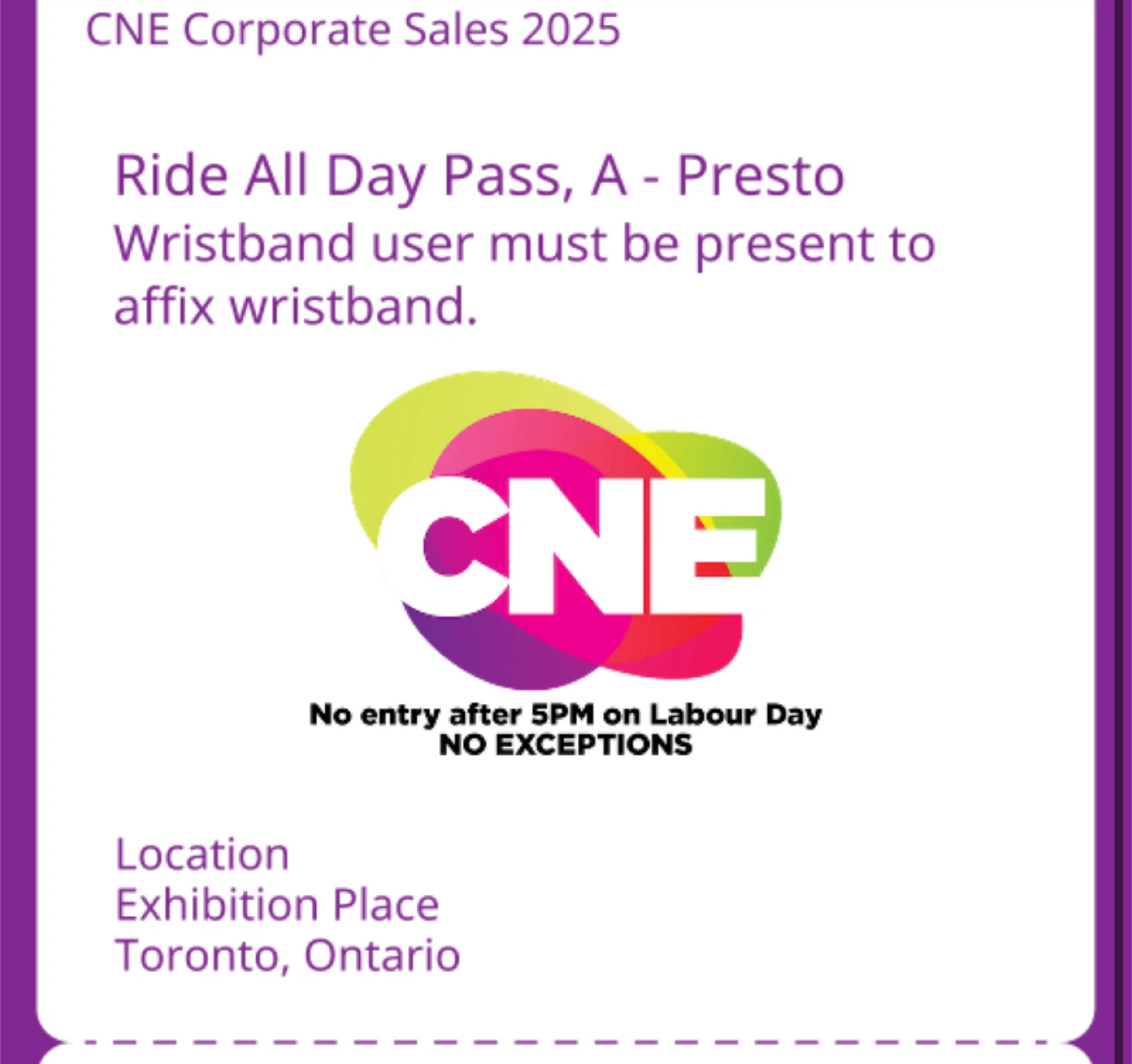 Selling a CNE (Canadian National Exhibition) Ride All Day Pass. This pass is valid for the 2025 season. Please note that the wristband user must be present to affix the wristband. Also, there is no entry after 5 PM on Labour Day with no exceptions! The location is Exhibition Place in Toronto, Ontario