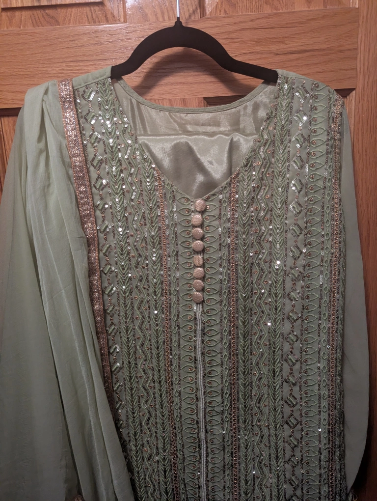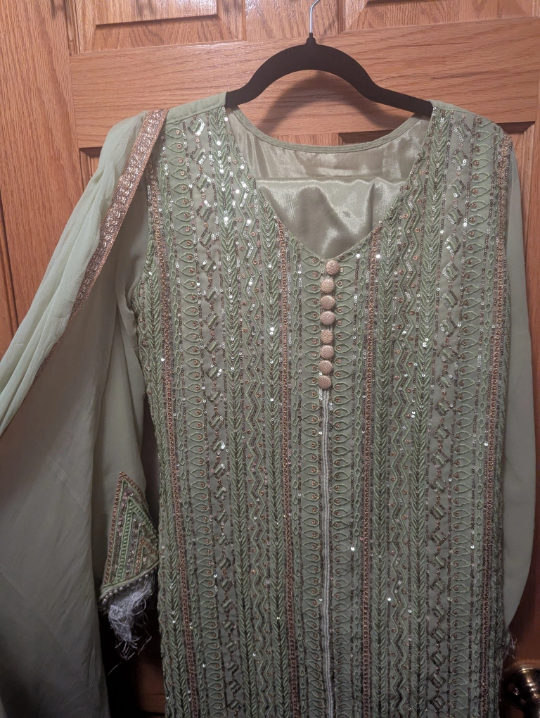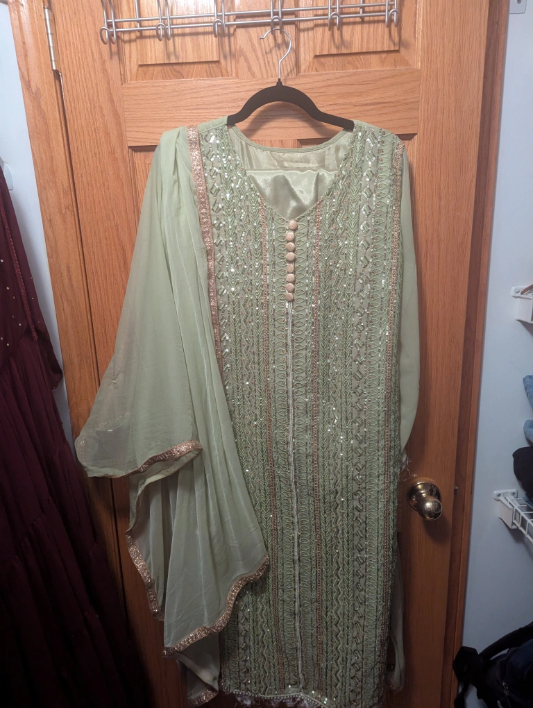 This is a beautiful green salwar kameez with intricate embellishments. It's perfect for a special occasion or just to add some elegance to your wardrobe. The material is lightweight and comfortable, making it easy to wear. The outfit includes the kameez, salwar, and dupatta. Size L