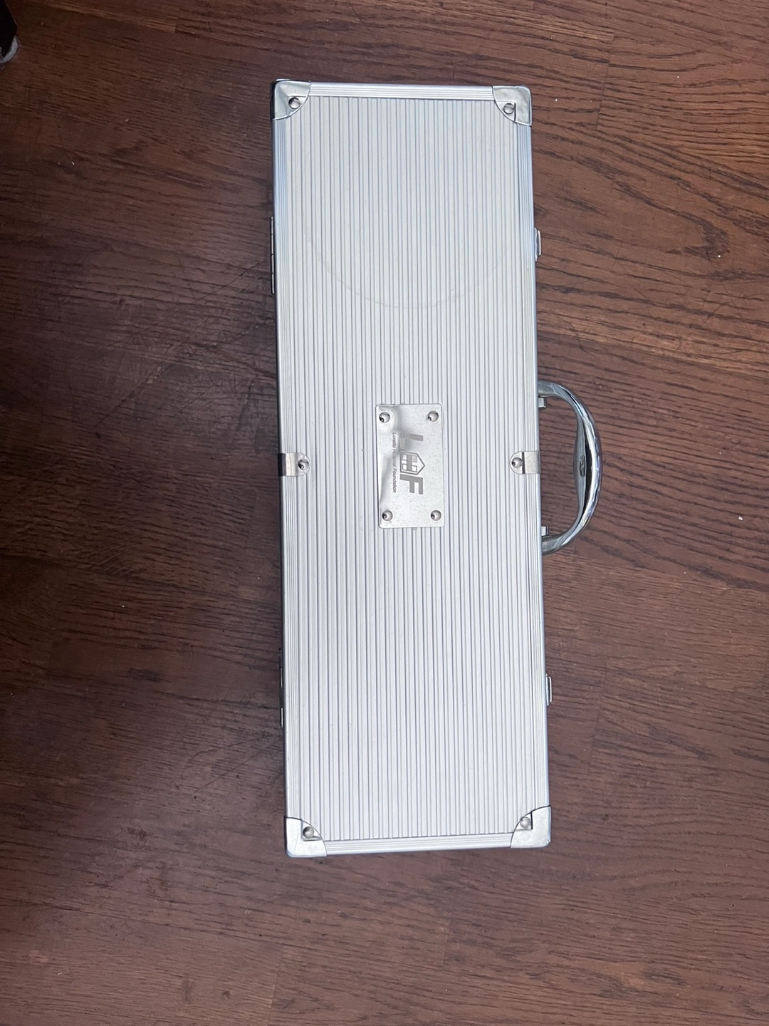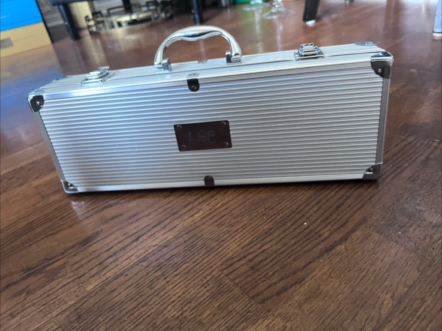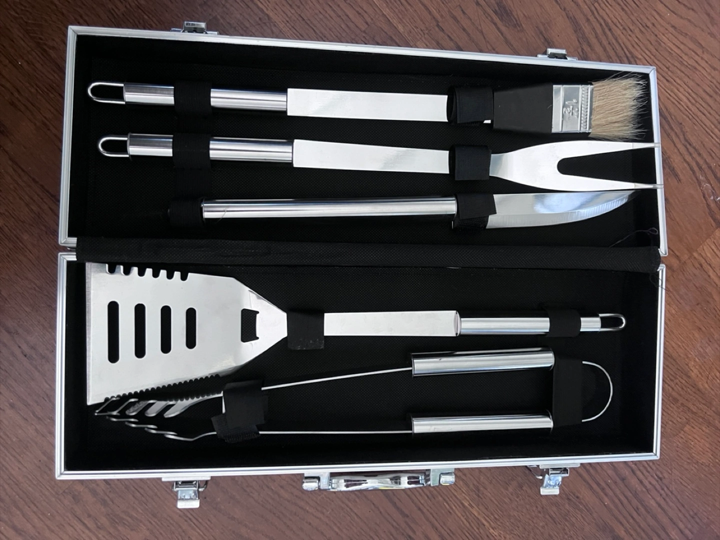 I'm selling a BBQ grill tool set that comes in a sturdy aluminum case. It includes all the essential tools you need for grilling, like a spatula, tongs, fork, knife, and brush. Perfect for outdoor cooking and keeping your tools organized! Brand new.