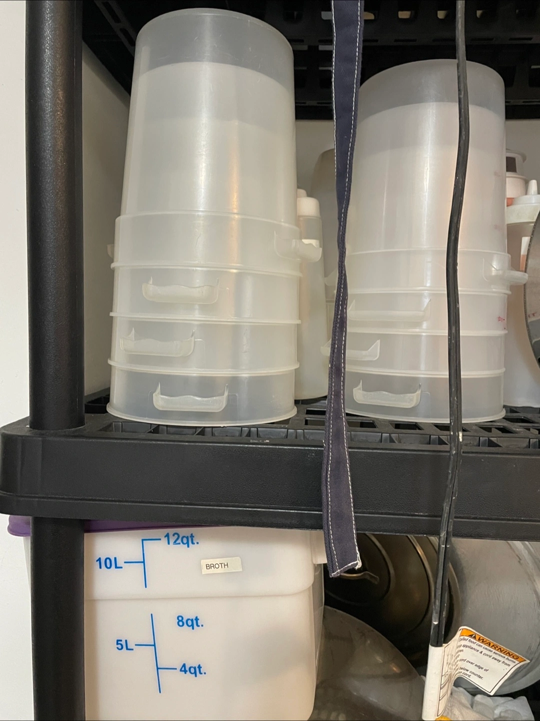 Selling some plastic food storage containers. They look to be in great shape and have measurement markings on the side (litres and quarts). Perfect for storing broth or other liquids!