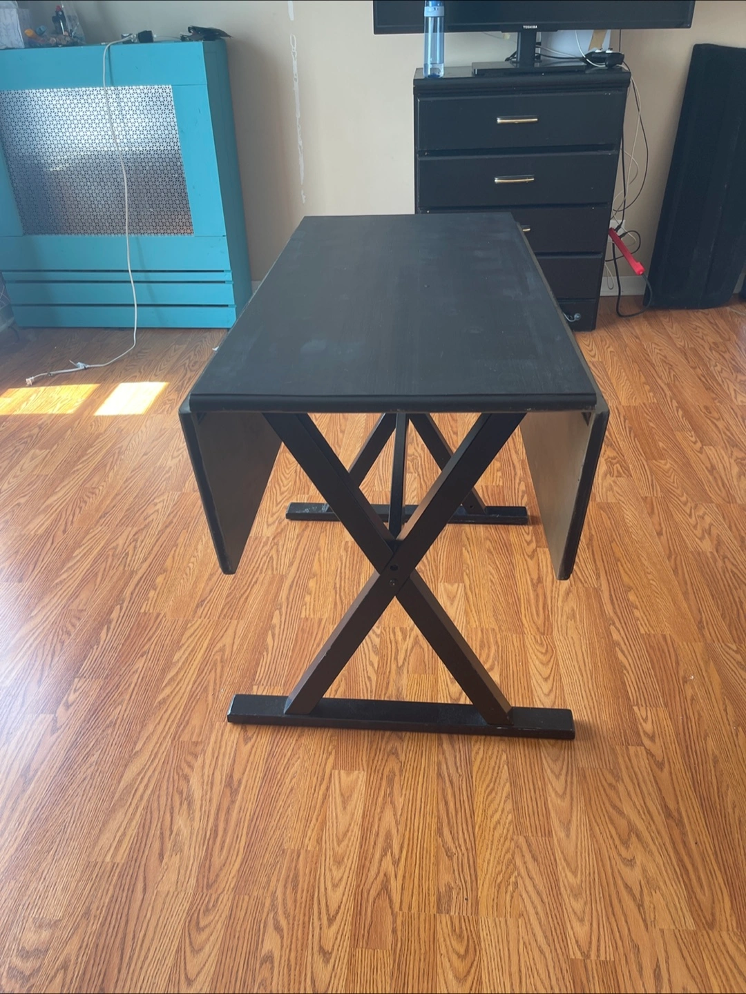 Selling a black table in good condition. It has a unique X-shaped leg design and can expand into the size you need for the occasion. Perfect for a small dining area or kitchen! The top of the table is painted with chalkboard paint making it excellent for game nights or for children.