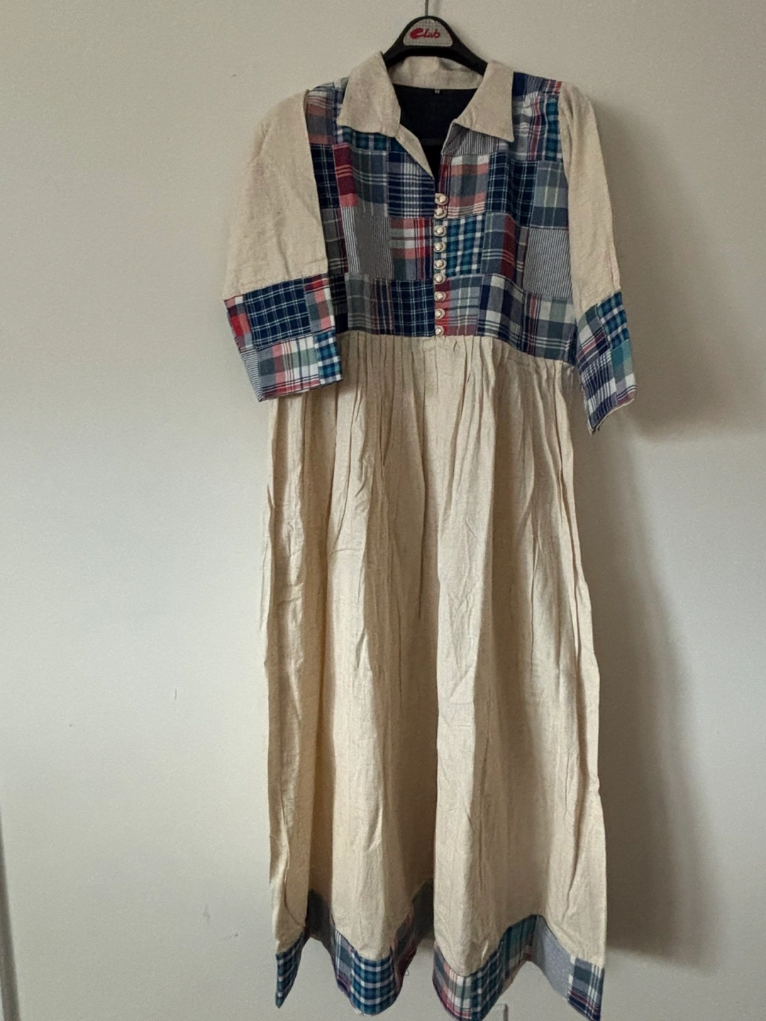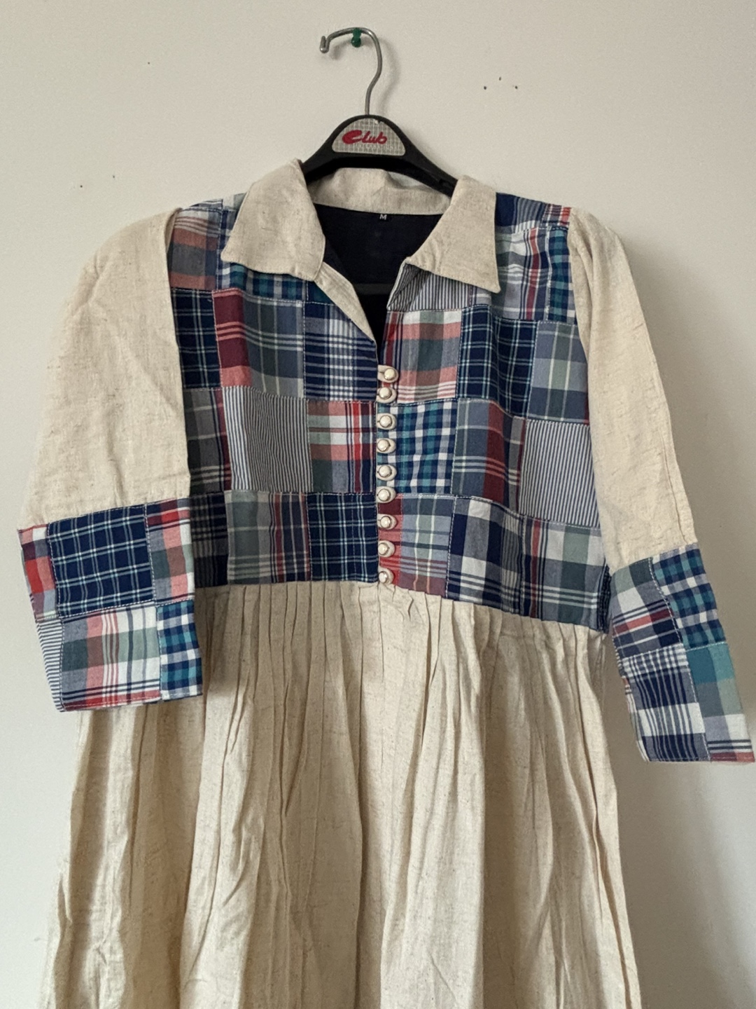 Here's a unique patchwork dress in beige! It features a collared neckline and button-down design. The dress is a size M and would be a great addition to your wardrobe