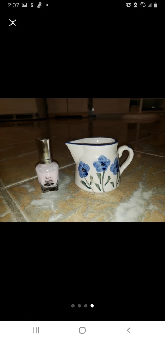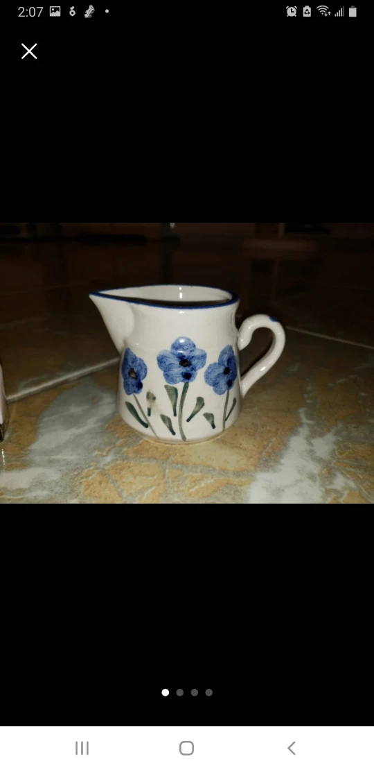 This is a charming little ceramic creamer pitcher! It features a lovely blue floral design. Perfect for adding a touch of whimsy to your table or kitchen.