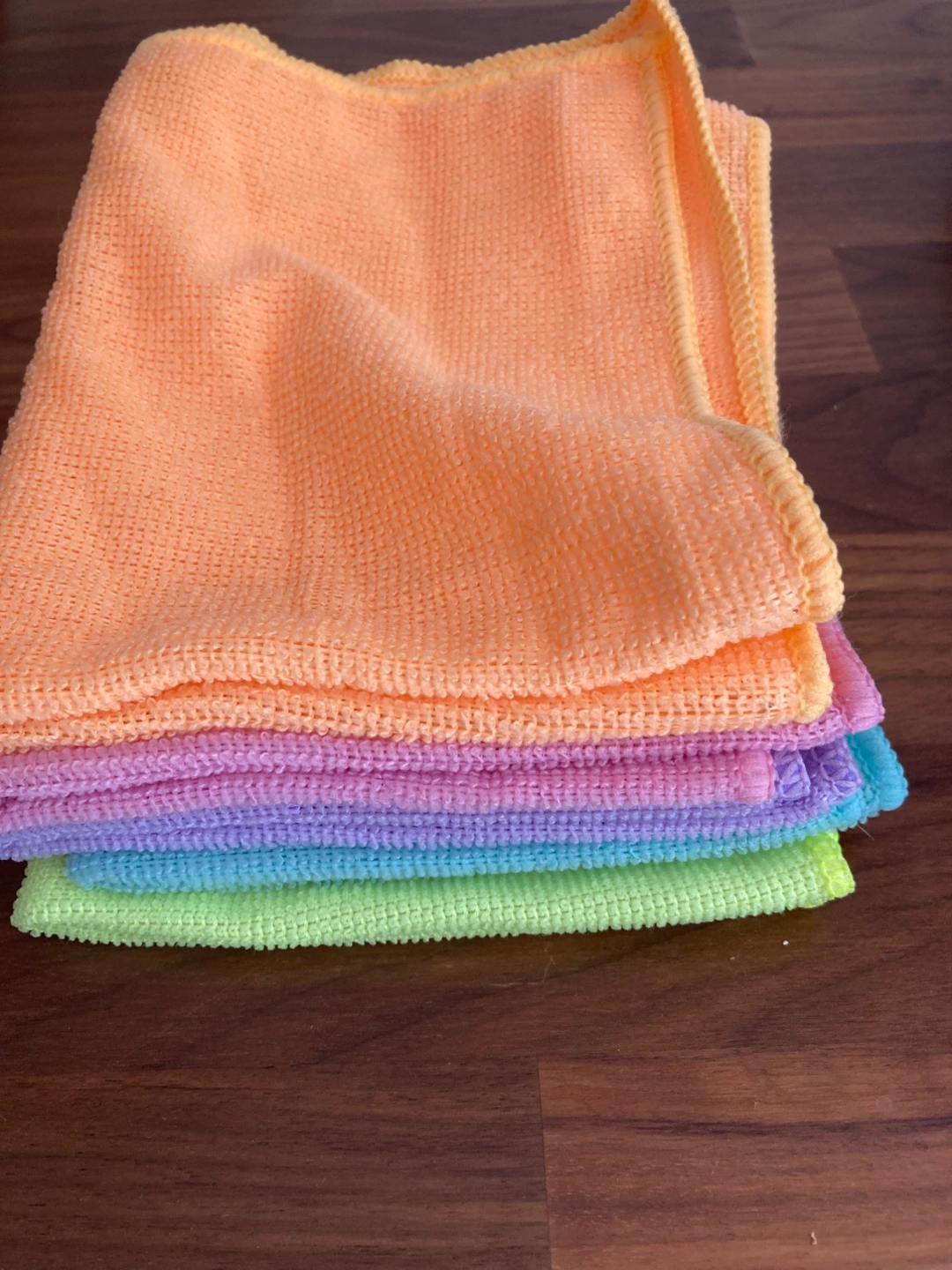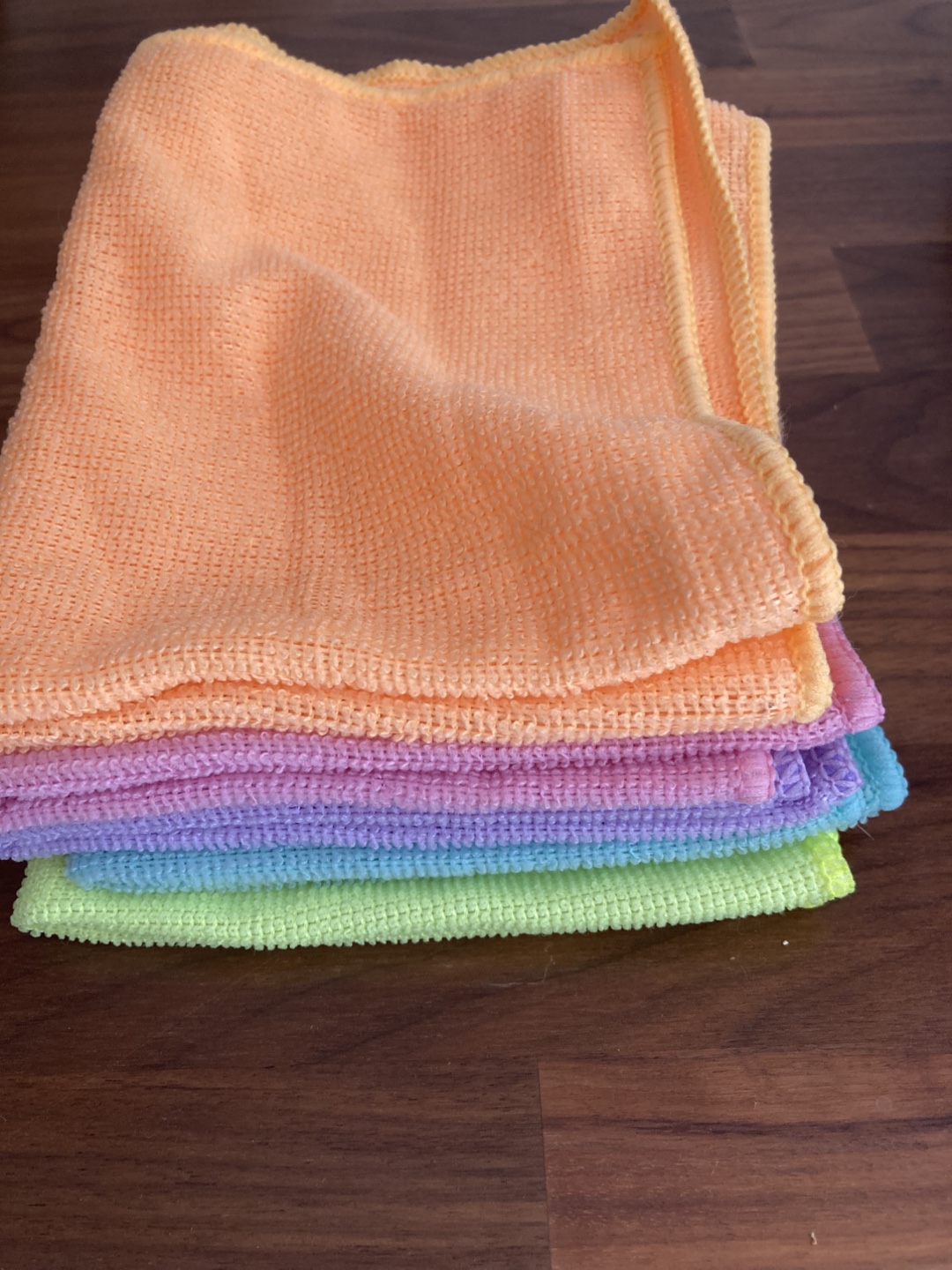 Selling a stack of colourful microfiber cleaning cloths! They're perfect for all sorts of cleaning jobs around the house. The colours are a soft peach, lilac, sky blue and lime green. They appear to be in great condition and ready to use!