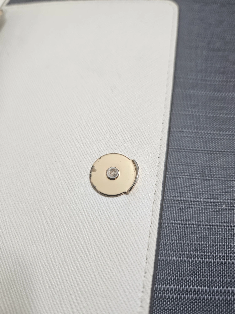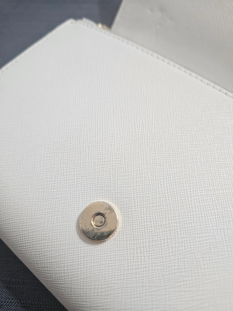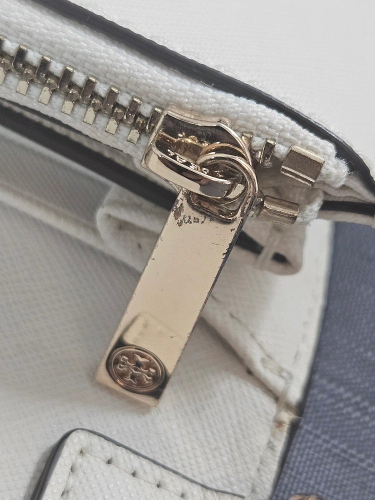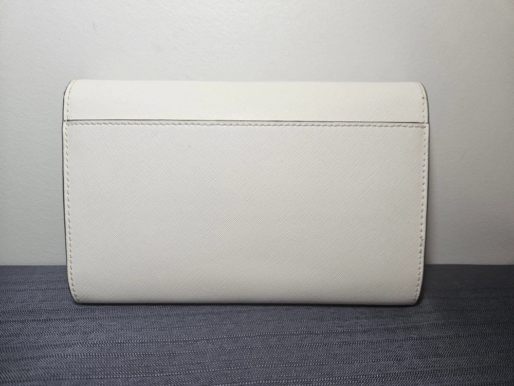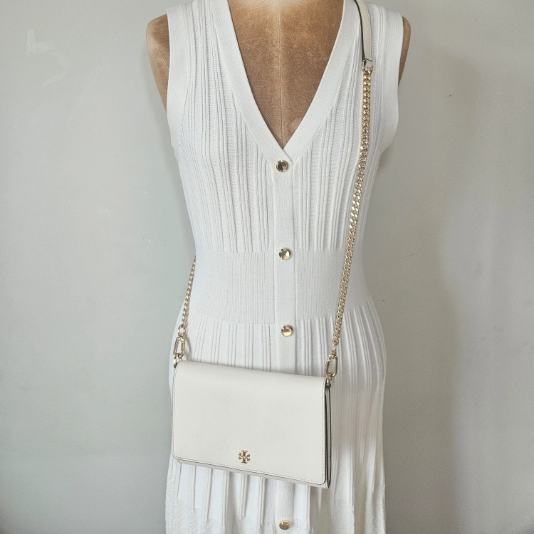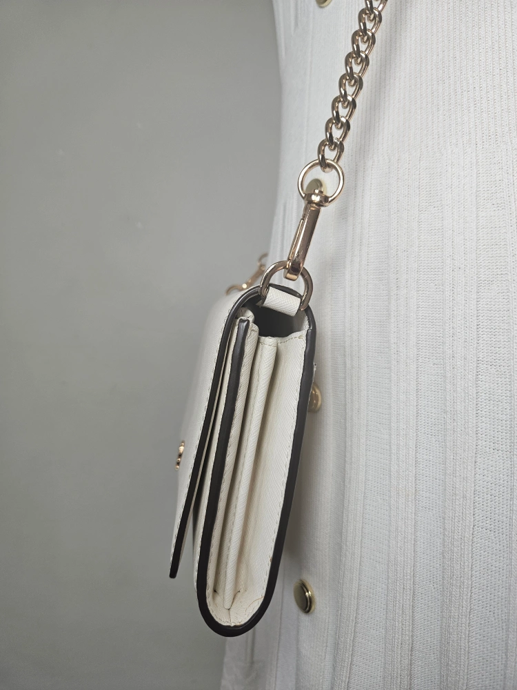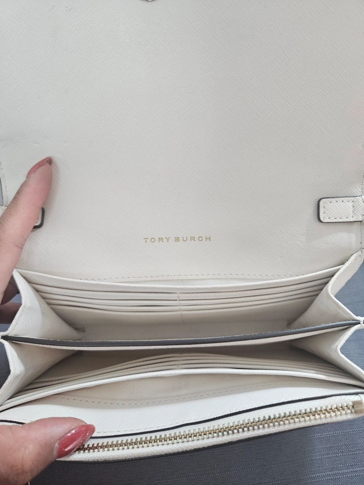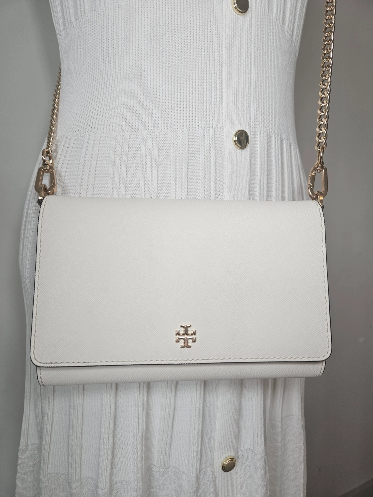 This is a Tory Burch Kira convertible wallet crossbody in a cream colour. It's in great condition with some wear and tear and perfect for carrying your essentials. The chain strap is convertible, so you can wear it as a crossbody or carry it as a wallet.
