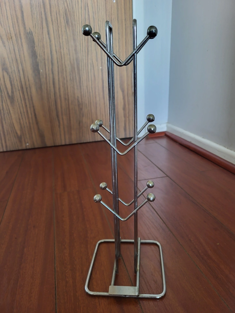 Here's a metal mug tree stand, perfect for organizing your mugs and saving cabinet space! It has a simple, modern design that will look great in any kitchen. It's in great shape and ready for a new home
