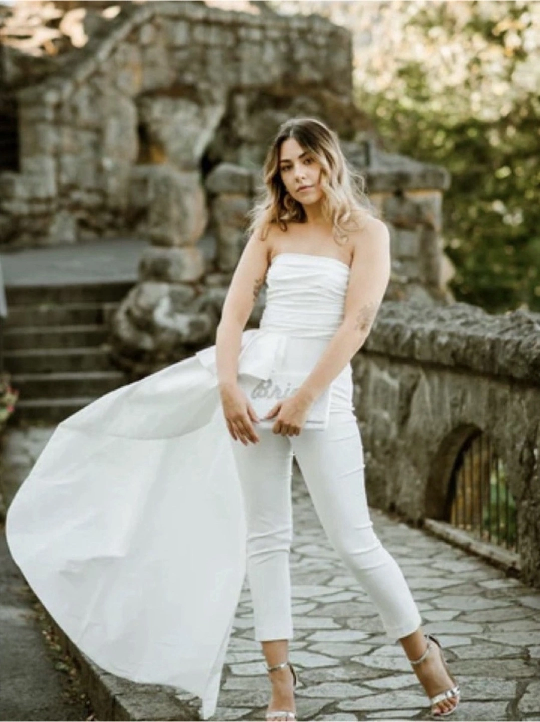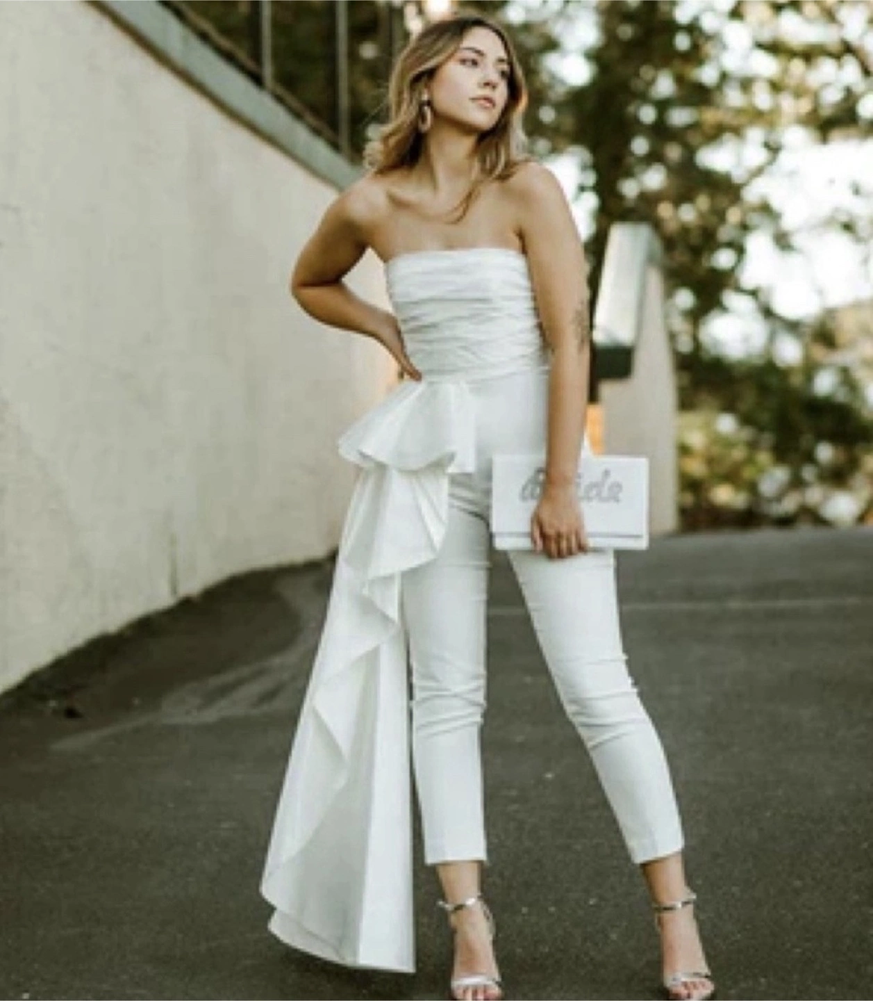Perfect for bridal showers, rehearsal dinner, bachelorette parties, or any other event! Product Features Size 0 Stretch crepe fabric Designed for a cropped length Straight neckline Hidden side zip Strapless, sleeveless Ruched details at bodice Fixed ruffle and train at right waist Imported Materials & Care Self & lining: 100% polyester Dry clean MSRP $350 Pickup near W 57th. Cash/venmo