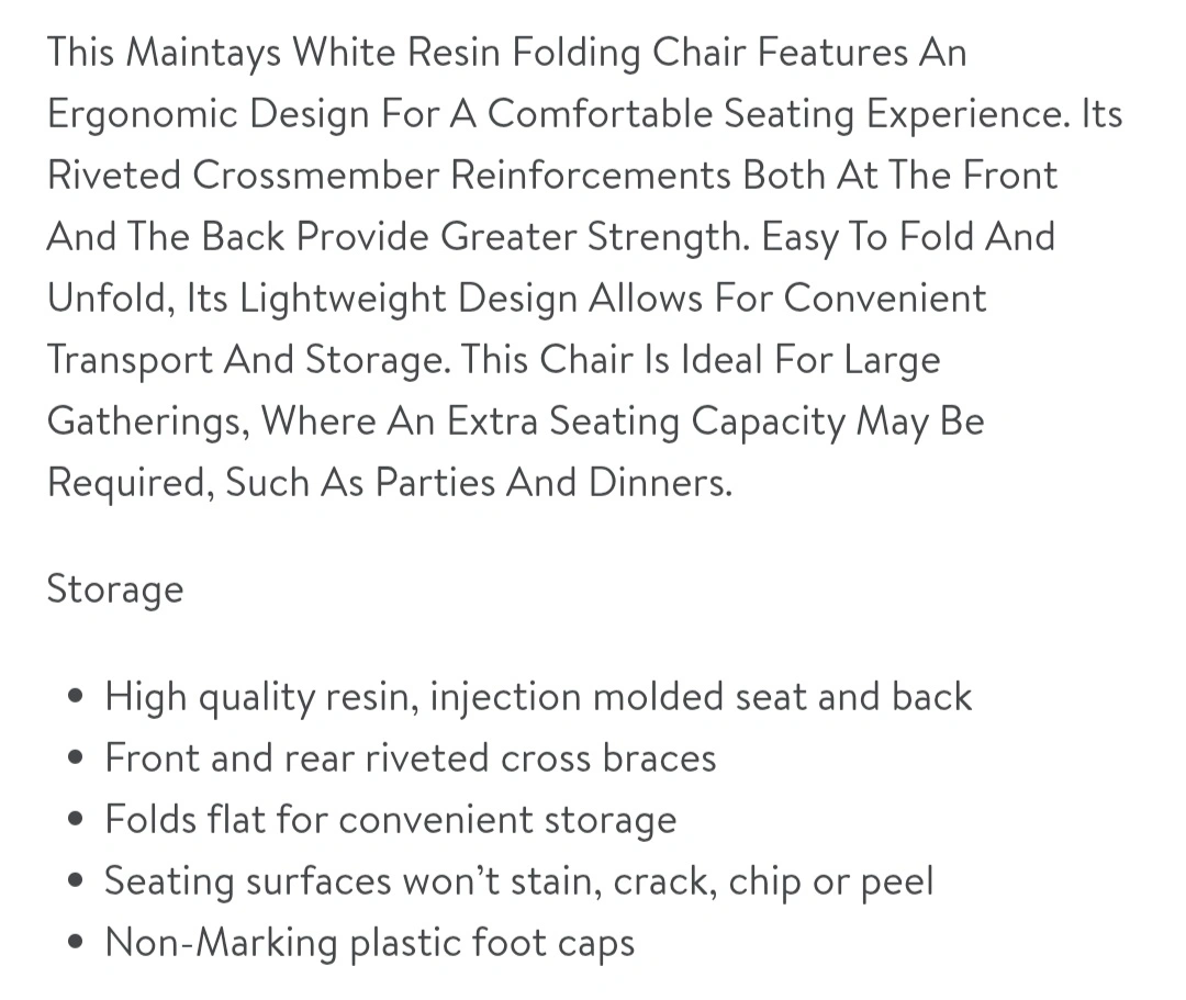 This Maintays white resin folding chair features an ergonomic design for a comfortable seating experience. It's easy to fold and unfold, and its lightweight design allows for convenient transport and storage. The chair is ideal for large gatherings, where an extra seating capacity may be required, such as parties and dinners. It also has front and rear riveted cross braces, and folds flat for convenient storage. The seating surfaces won't stain, crack, chip, or peel, and it also has non-marking plastic foot caps