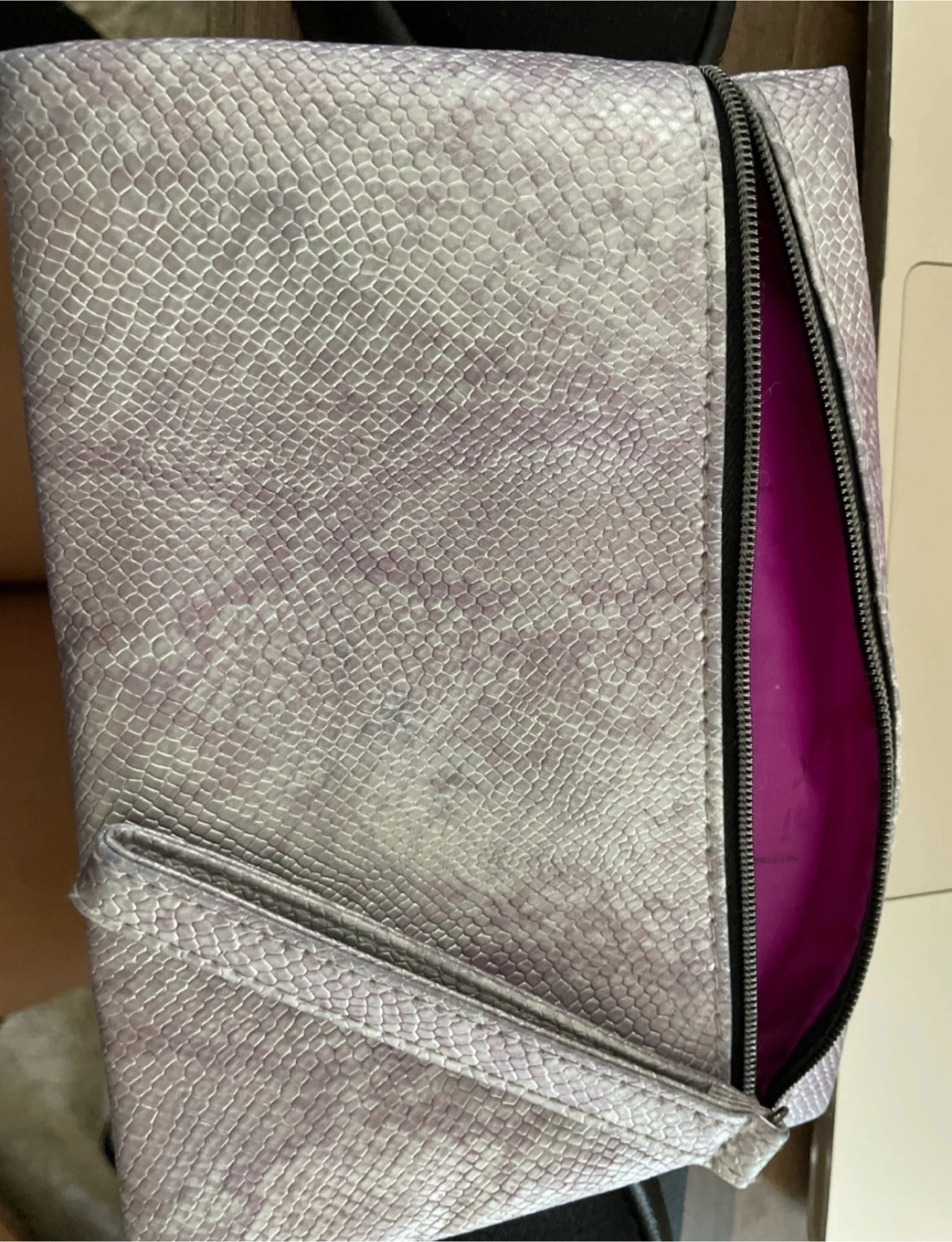 Here's a stylish clutch featuring a snakeskin pattern! It has a convenient wrist strap and a zipper closure. The inside is lined with a bright pink fabric. It's perfect for a night out or keeping your essentials organized