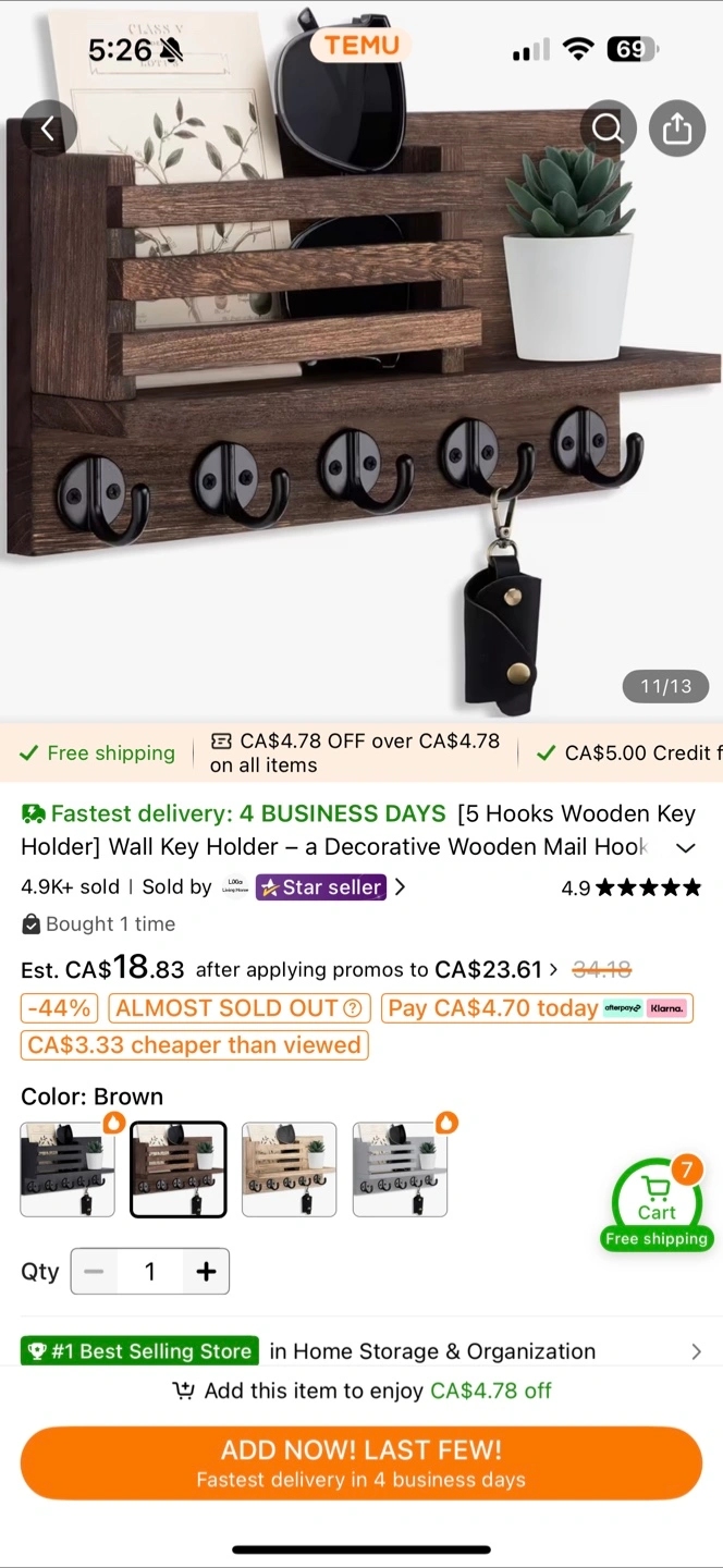 This is a decorative wooden mail hook and key holder. It has 5 hooks and is brown in colour. It's from Temu and is a #1 Best Selling Store item in Home Storage & Organization.