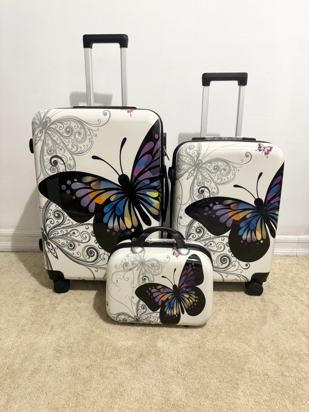 Selling a cute 3-piece spinner luggage set with a butterfly design! It includes a 3-piece set, perfect for all your travel needs. Brand new in box ๐ฆ