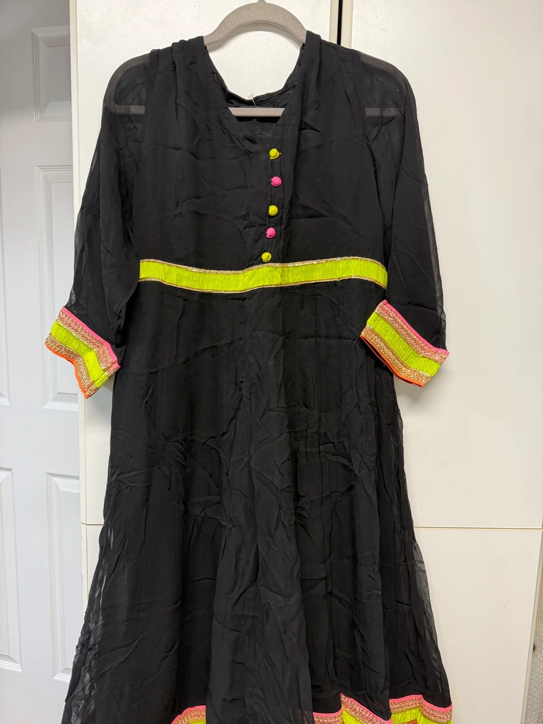 This black kurti from Pink Lemon is a size XL. It features colourful trim details on the waist and cuffs, with bright yellow, pink, and green accents. The material looks lightweight and flowy, perfect for warmer weather or cultural events.