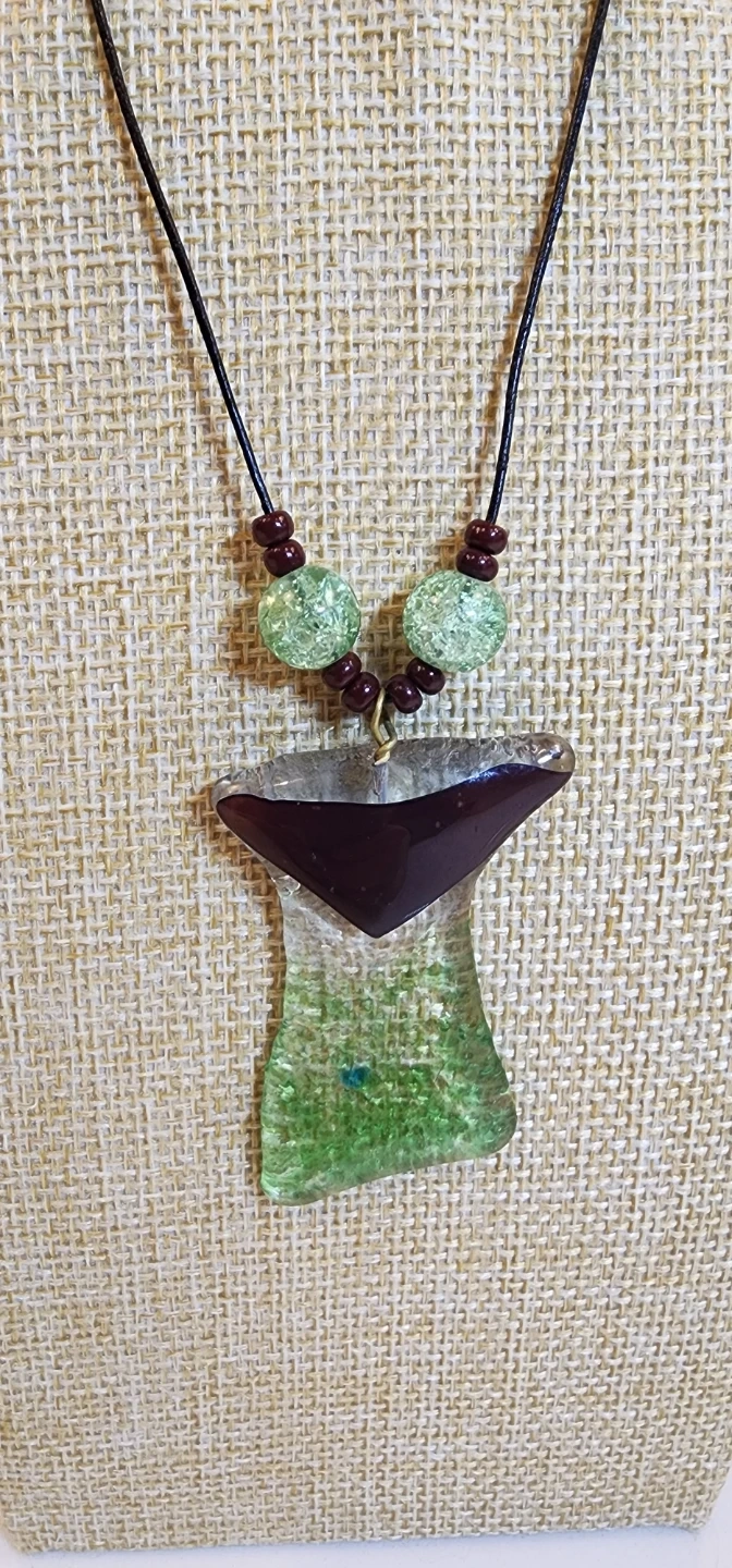 Unique handmade necklace featuring a glass pendant with green and brown accents. The pendant is complemented by green and brown beads on a black cord. It's a one-of-a-kind piece to add a touch of artistry to your style
