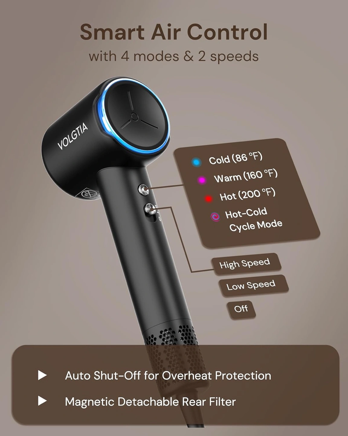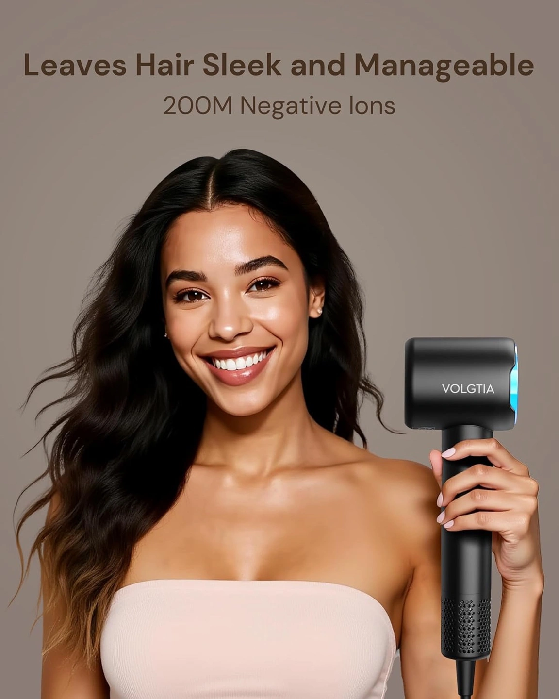 This VOLGTIA hair dryer is lightweight and portable, weighing only 0.85 lb! It offers 3X drying speed and is engineered for quiet performance with 6 layers of noise reduction at 61 dB. It also leaves hair sleek and manageable with 200M negative ions
