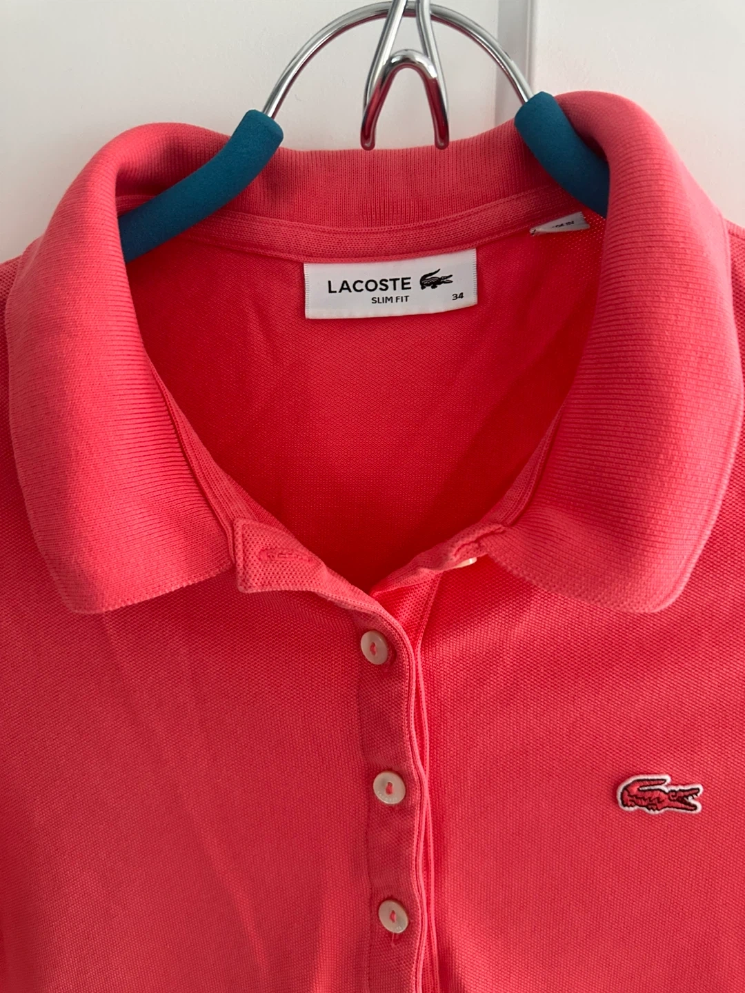 Selling a Lacoste slim fit polo shirt in a lovely coral colour. It's a size 34. Perfect for a casual day out or dressing up a bit!