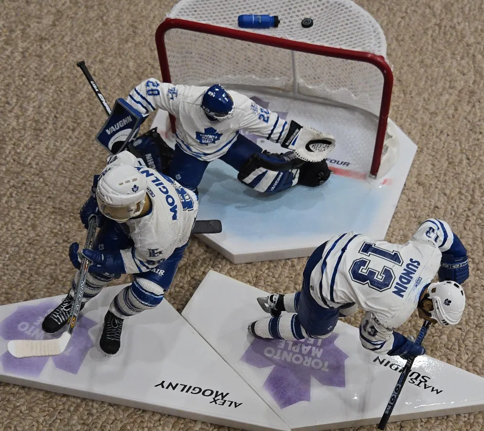 Selling a set of Toronto Maple Leafs hockey figurines. The set includes figures of Mogilny, Sundin, and Belfour, complete with a hockey net. A great collectible for any Leafs fan!