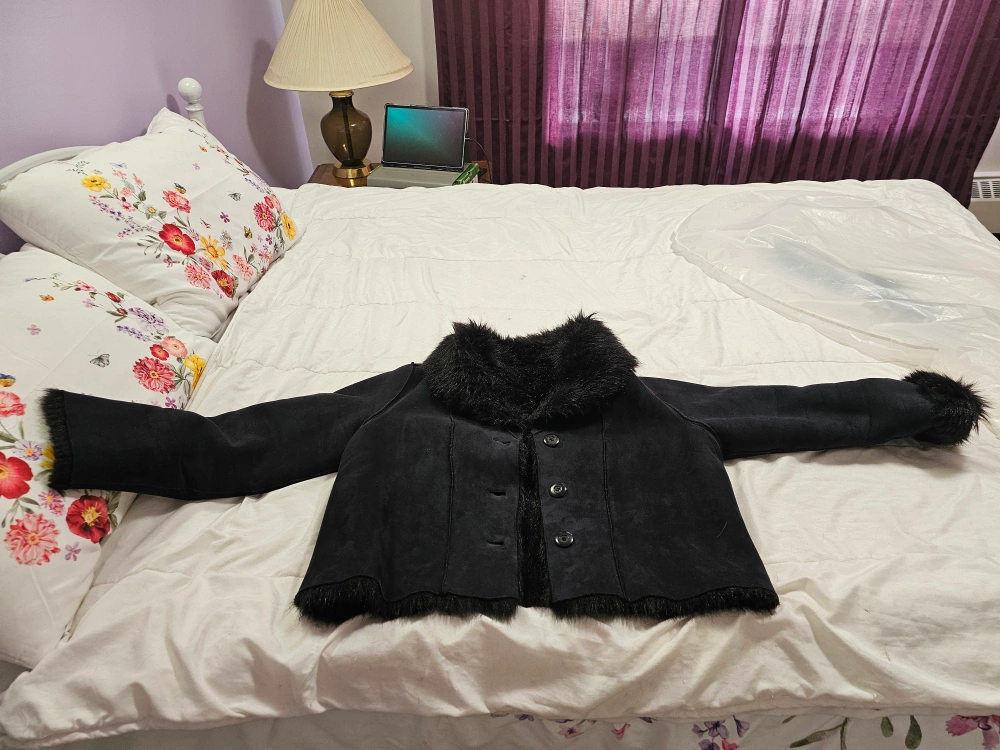 Selling a stylish black jacket! It features a soft suede-like exterior and cozy faux fur trim. Perfect for adding a touch of warmth and elegance to your outfit on cooler days. It's in great condition and ready for a new home