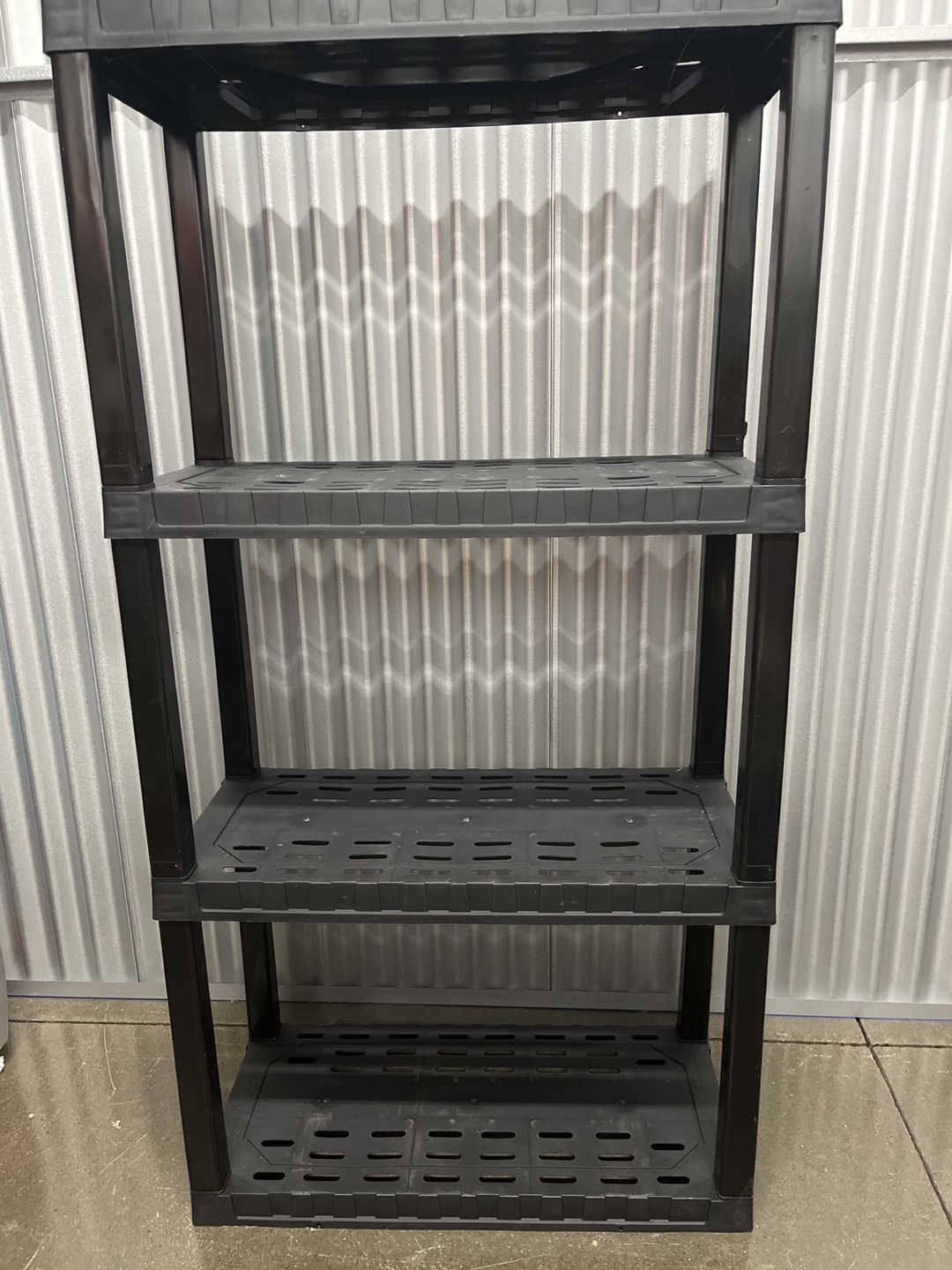 Here's a handy black plastic storage unit with 4 shelves! It's perfect for organizing your garage, basement, or any space that needs a little tidying up. It's in great shape and ready to hold your items