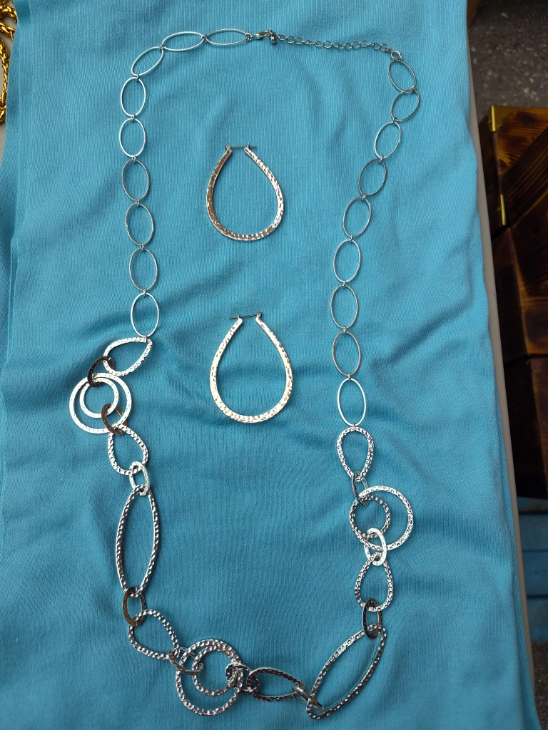 Selling a necklace and earring set. The necklace is silver and features a variety of shapes. The earrings are teardrop shaped and appear to be gold in colour. Perfect to dress up any outfit! cash p/u Streetsville