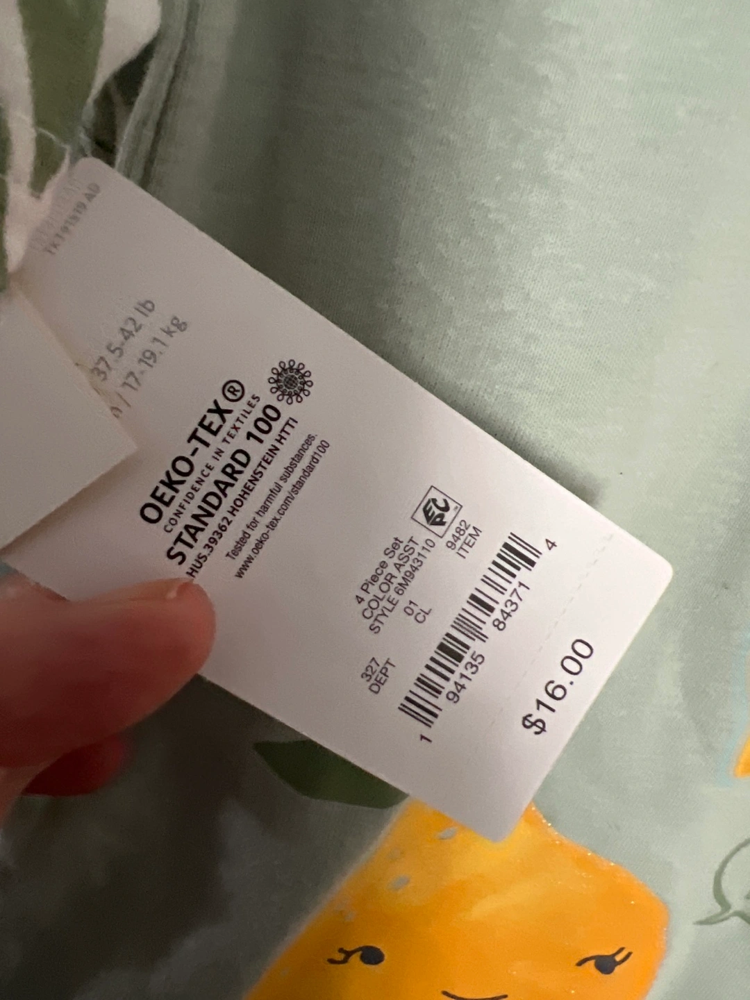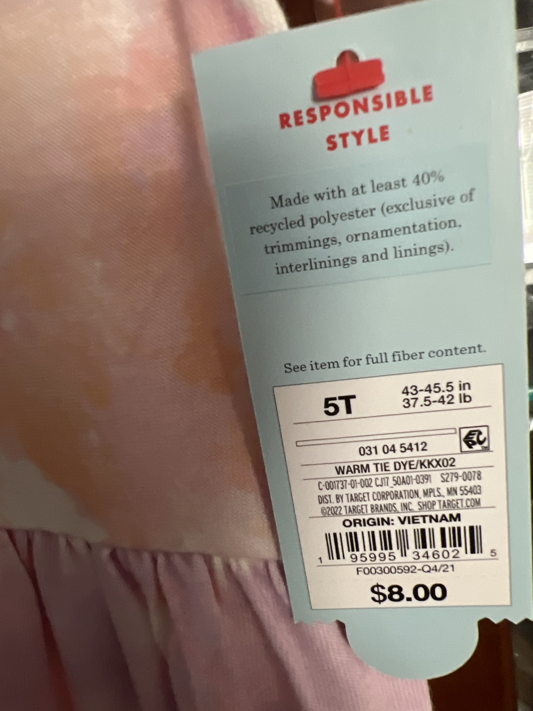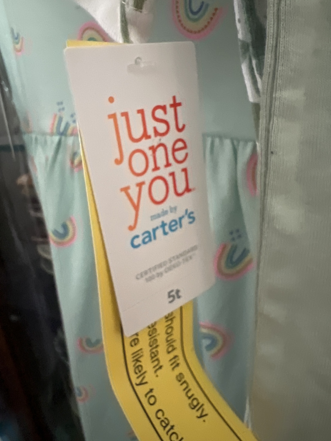 Selling a bundle of girls clothes, size 5T. Includes two dresses from Cat & Jack and 2 pajama sets from The tag on one of the dresses indicates that it's made with at least 40% recycled polyester