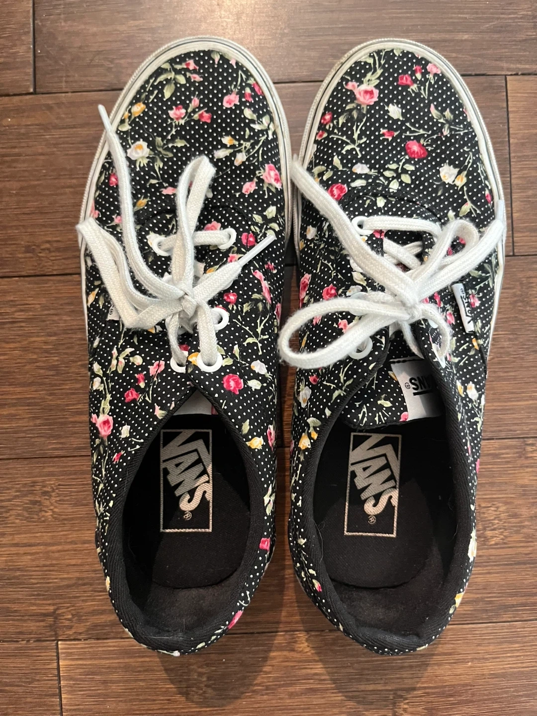 Selling a pair of Vans sneakers with a cute floral print on a black background! They are a women's size 8. Good and they still have lots of life left in them. Perfect for adding a touch of fun to your casual outfits!