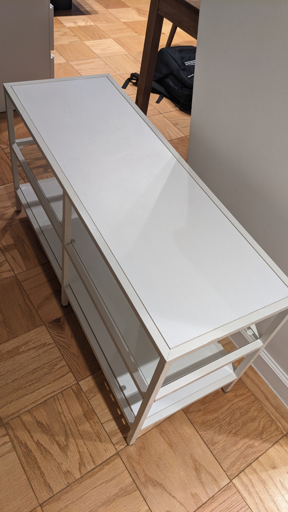 Selling a console table in white. It measures approximately 39 inches in length and 14 inches in width. Great for an entryway or living room!