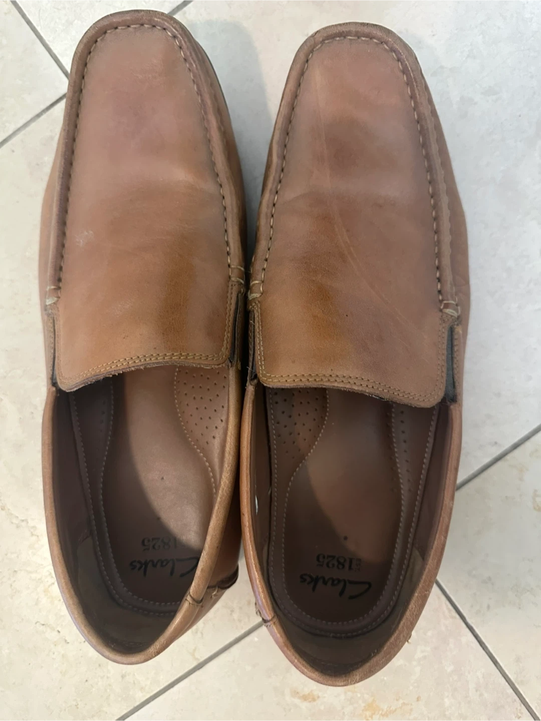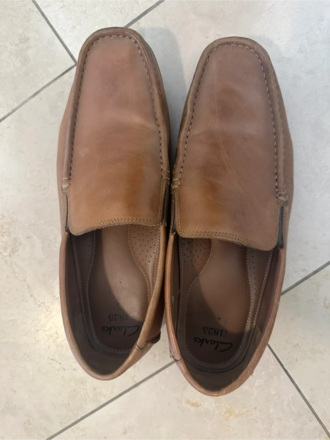 These are a pair of classic brown leather loafers from Clarks 1825. They are in good condition and ready for a new home. A comfortable and stylish choice for everyday wear!