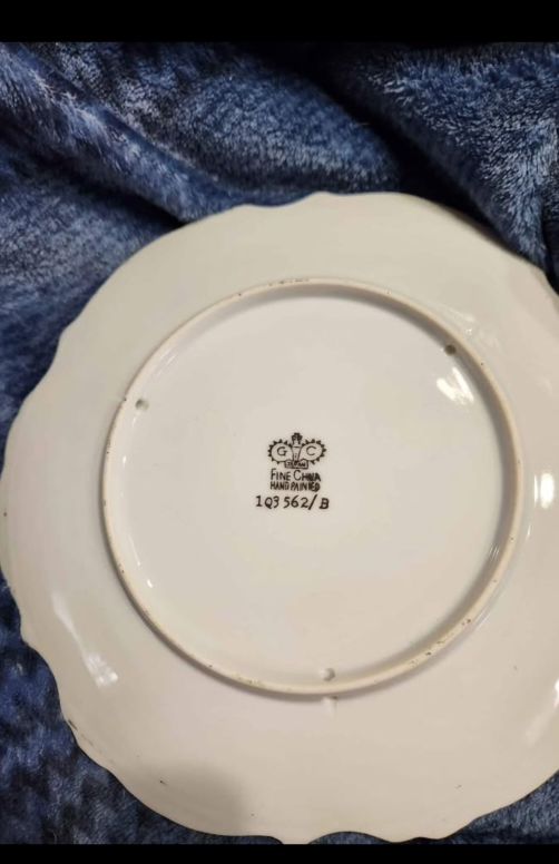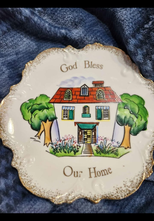 This decorative plate features a charming house scene with the words "God Bless Our Home". The plate has a gold trim and scalloped edge. On the back, the logo "G Fine China Hand Painted 1QS 562/B" is visible. Perfect for adding a touch of warmth to any room